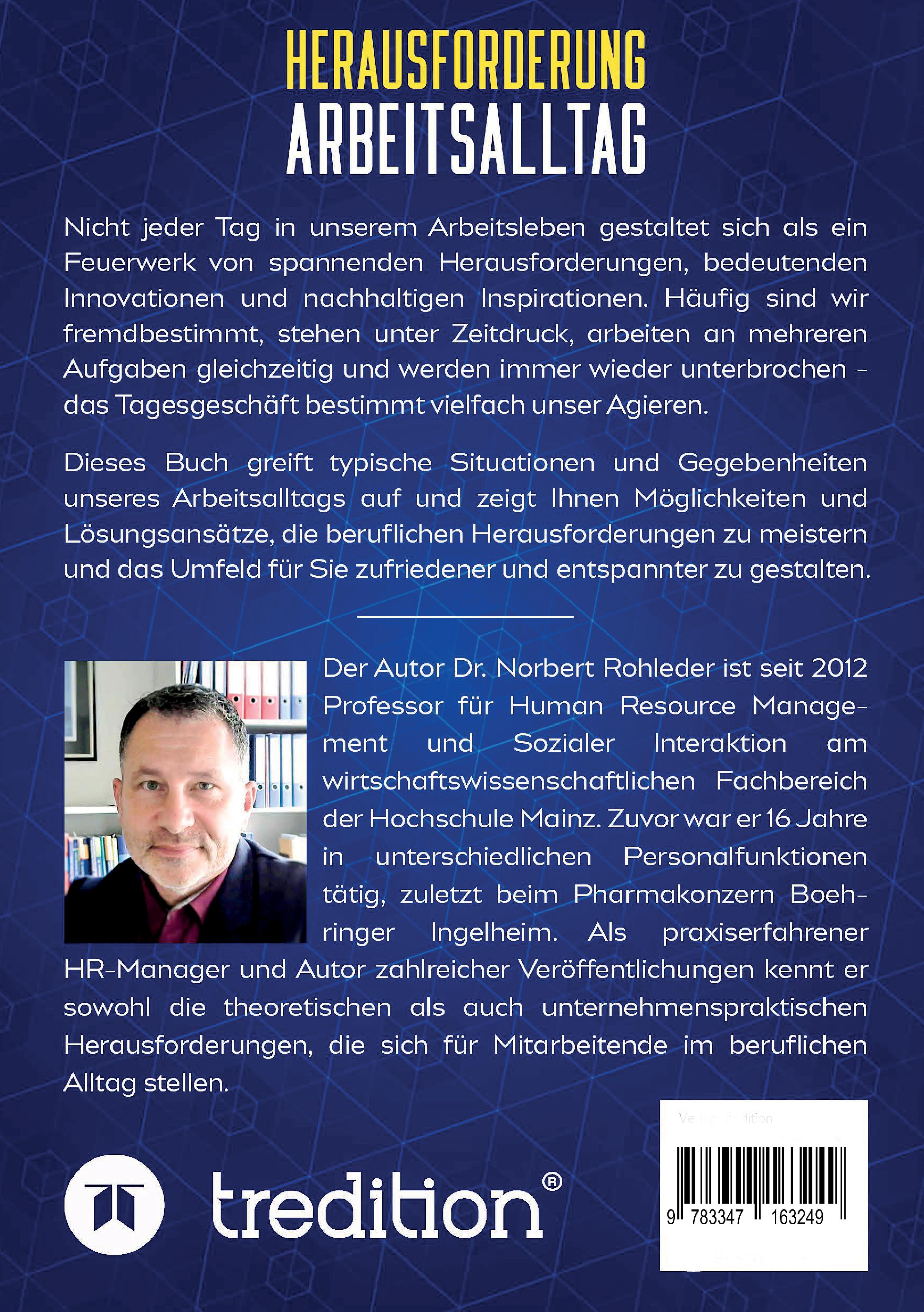 Dr. Norbert Rohleder ist seit 2012 Professor für Human Resource Management und Soziale Interaktion am wirtschaftswissenschaftlichen Fachbereich der Hochschule Mainz. Zuvor war er 16 Jahre in unterschiedlichen Personalfunktionen tätig, zuletzt beim Pharmakonzern Boehringer Ingelheim. Als praxiserfahrener HR-Manager und Autor zahlreicher Veröffentlichungen kennt er sowohl die theoretischen als auch unternehmenspraktischen Anforderungen an ein Human Resources Management. Ein besonderes Interesse gilt auch dem Themengebiet "Arbeitsbelastung" und den damit einhergehenden Herausforderungen für Mitarbeitende.