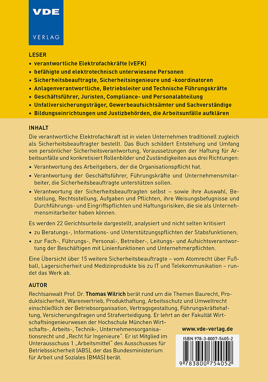 Die verantwortliche Elektrofachkraft ist in vielen Unternehmen traditionell zugleich als Sicherheitsbeauftragter bestellt. Das Buch schildert Entstehung und Umfang von persönlicher Sicherheitsverantwortung, Voraussetzungen der Haftung für Arbeitsunfälle und konkretisiert Rollenbilder und Zuständigkeiten aus drei Richtungen:- Verantwortung des Arbeitgebers, der die Organisationspflicht hat.- Verantwortung der Geschäftsführer, Führungskräfte und Unternehmensmitarbeiter, die Sicherheitsbeauftragte unterstützen sollen.- Verantwortung der Sicherheitsbeauftragten selbst - sowie ihre Auswahl, Bestellung, Rechtsstellung, Aufgaben und Pflichten, ihre Weisungsbefugnisse und Durchführungs- und Eingriffspflichten und Haftungsrisiken, die sie als Unternehmensmitarbeiter haben können.Es werden 22 Gerichtsurteile dargestellt, analysiert und nicht selten kritisiert- zu Beratungs-, Informations- und Unterstützungspflichten der Stabsfunktionen;- zur Fach-, Führungs-, Personal-, Betreiber-, Leitungs- und Aufsichtsverantwortung der Beschäftigen mit Linienfunktionen und Unternehmerpflichten.Eine Übersicht über 15 weitere Sicherheitsbeauftragte - vom Atomrecht über Fußball, Lagersicherheit und Medizinprodukte bis zu IT und Telekommunikation - rundet das Werk ab.