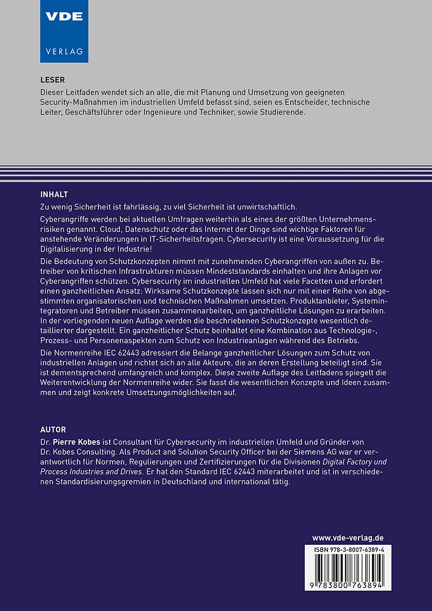 Zu wenig Sicherheit ist fahrlässig, zu viel Sicherheit ist unwirtschaftlich.Erstmals rückt die Angst vor Cyberangriffen bei einer aktuellen Umfrage unter die drei größten Unternehmensrisiken auf. Cloud, Datenschutz, Mobile oder das Internet der Dinge sind wichtige Faktoren für anstehende Veränderungen in IT-Sicherheitsfragen. Ein IT-Experte formulierte es so: "Ohne IT-Sicherheit wird Industrie 4.0 nicht akzeptiert.""Im Zuge der zunehmenden Zugriffe von außen, wächst die Bedeutung von Schutzkonzepten, was die deutsche Regierung durch die Verabschiedung des IT-Sicherheitsgesetzes erkannt hat. Betreiber kritischer Infrastrukturen müssen IT-Security-Mindeststandards einhalten und ihre Anlagen gegen Cyberangriffe schützen. Wirksame Schutzkonzepte lassen sich nur mit einem Bündel abgestimmter organisatorischer und technischer Maßnahmen umsetzen. Dabei sind alle Beteiligten gefordert, die Produkthersteller, die Integratoren und die Betreiber müssen Hand in Hand ganzheitliche Lösungen erarbeiten.Die Normenreihe IEC 62443 adressiert die Belange ganzheitlicher Lösungen zum Schutz von industriellen Anlagen und richtet sich an alle Akteure, die an deren Erstellung beteiligt sind. Sie ist dementsprechend umfangreich und komplex. Dieser kurze Leitfaden gibt einen Überblick über die Normenreihe, fasst die wesentlichen Konzepte und Ideen zusammen und zeigt konkrete Umsetzungsmöglichkeiten auf.