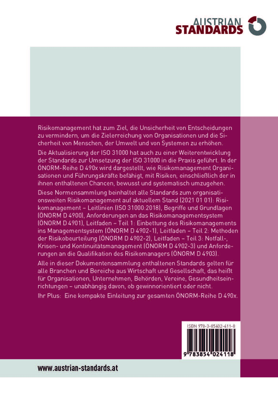 | Schlagworte | Corporate Governance • Enterprise Risk Management • High Level Structure • ISO 31000 • Kontinuitätsmanagement • Krisenmanagement • Krisenstab • krisenszenario • Managementsystem • Notfallmanagement • Notfallszenario • ÖNORM ISO 31000 • ÖNORM-Reihe D 490x • Organisations-Risikomanagement • Projektrisikomanagement • Qualitätsmanagement • Risiken • Risiko • Risikobeurteilung • Risikokriterien • Risikokultur • Risikomanagement • Risikomanagement - Leitlinien • Risikomanagementprozess • Risikomanagementsystem • Risikomanager • Risikoszenario • Risk • Risk Management • Strategisches Management • Zertifizierung |
