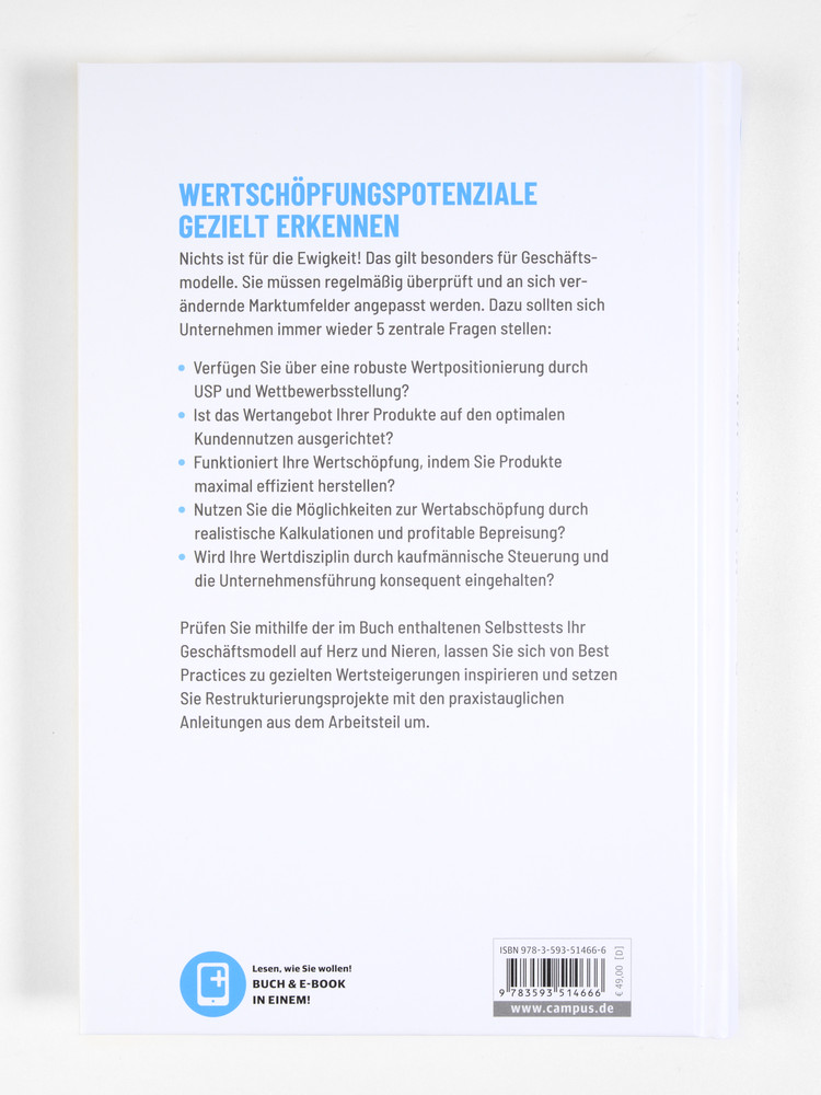 Wertschöpfungspotenziale gezielt erkennenNichts ist für die Ewigkeit! Das gilt besonders für Geschäftsmodelle. Sie müssen regelmäßig überprüft und an sich verändernde Marktumfelder angepasst werden. Dazu sollten sich Unternehmen immer wieder 5 zentrale Fragen stellen:- Verfügen Sie über eine robuste Wertpositionierung durch USP und Wettbewerbsstellung?- Ist das Wertangebot Ihrer Produkte auf den optimalen Kundennutzen ausgerichtet?- Funktioniert Ihre Wertschöpfung, indem Sie Produkte maximal effizient herstellen?- Nutzen Sie die Möglichkeiten zur Wertabschöpfung durch realistische Kalkulationen und profitable Bepreisung?- Wird Ihre Wertdisziplin durch kaufmännische Steuerung und die Unternehmensführung konsequent eingehalten?Prüfen Sie mithilfe der im Buch enthaltenen Selbsttests Ihr Geschäftsmodell auf Herz und Nieren, lassen Sie sich von Best Practices zu gezielten Wertsteigerungen inspirieren und setzen Sie Restrukturierungsprojekte mit den praxistauglichen Anleitungen aus dem Arbeitsteil um.