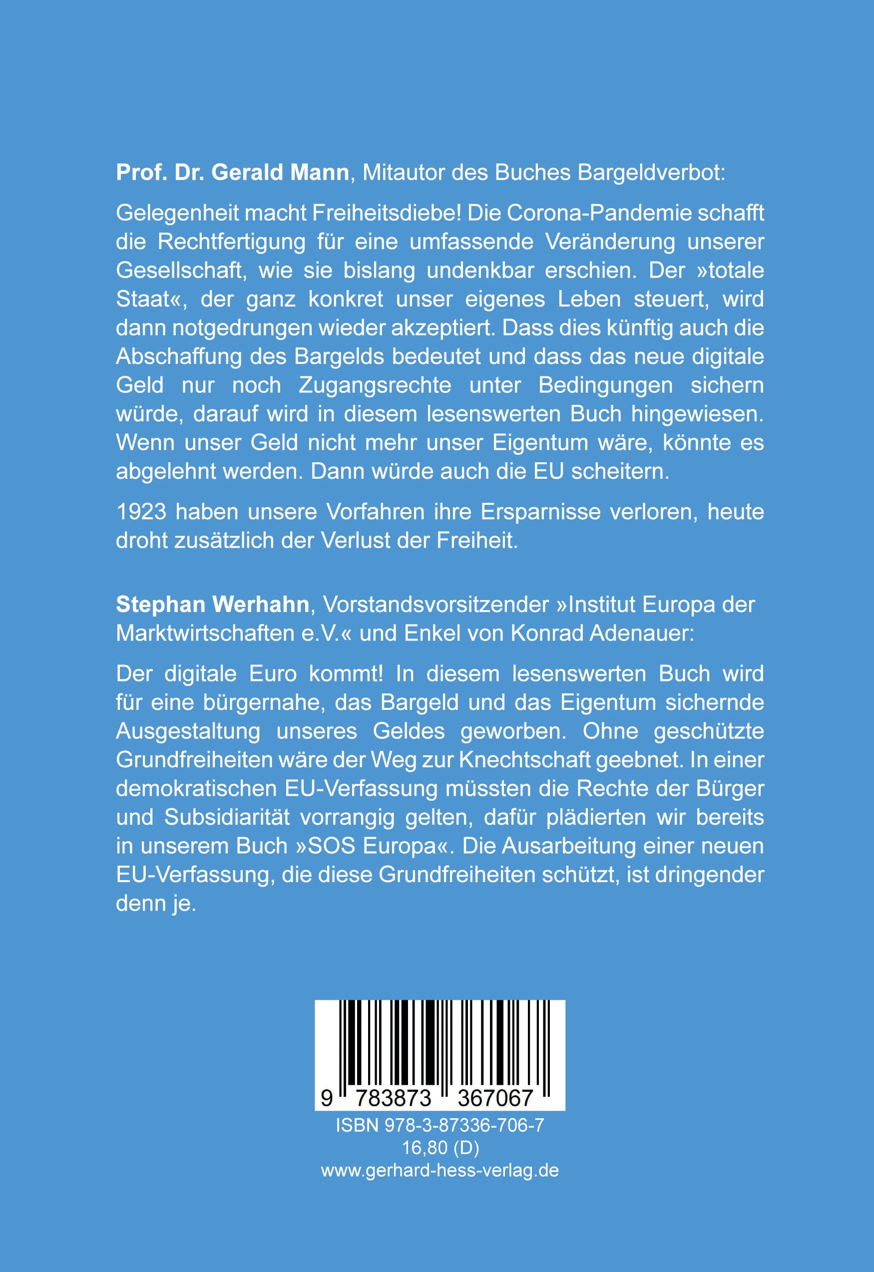 Prof. Dr. Gerald Mann, Mitautor des Buches Bargeldverbot: Gelegenheit macht Freiheitsdiebe! Die Corona-Pandemie schafft die Rechtfertigung für eine umfassende Veränderung unserer Gesellschaft, wie sie bislang undenkbar erschien. Der »totale Staat«, der ganz konkret unser eigenes Leben steuert, wird dann notgedrungen wieder akzeptiert. Dass dies künftig auch die Abschaffung des Bargelds bedeutet und dass das neue digitale Geld nur noch Zugangsrechte unter Bedingungen sichern würde, darauf wird in diesem lesenswerten Buch hingewiesen. Wenn unser Geld nicht mehr unser Eigentum wäre, könnte es abgelehnt werden. Dann würde auch die EU scheitern. 1923 haben unsere Vorfahren ihre Ersparnisse verloren, heute droht zusätzlich der Verlust der Freiheit.Stephan Werhahn, Vorstandsvorsitzender »Institut Europa der Marktwirtschaften e.V.« und Enkel von Konrad Adenauer: Der digitale Euro kommt! In diesem lesenswerten Buch wird für eine bürgernahe, das Bargeld und das Eigentum sichernde Ausgestaltung unseres Geldes geworben. Ohne geschützte Grundfreiheiten wäre der Weg zur Knechtschaft geebnet. In einer demokratischen EU-Verfassung müssten die Rechte der Bürger und Subsidiarität vorrangig gelten, dafür plädierten wir bereits in unserem Buch »SOS Europa«. Die Ausarbeitung einer neuen EU-Verfassung, die diese Grundfreiheiten schützt, ist dringender denn je.