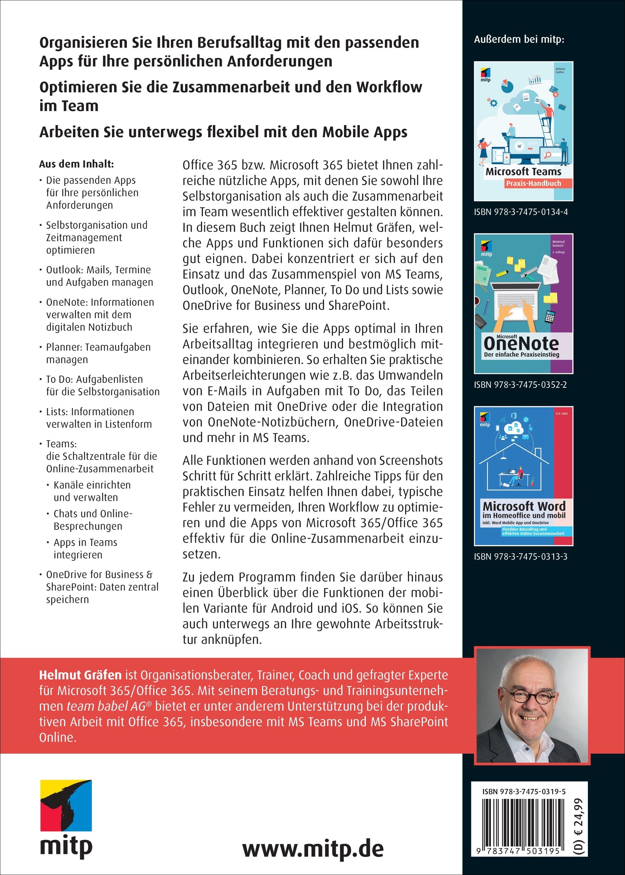 Office 365 bzw. Microsoft 365 bietet Ihnen zahlreiche nützliche Apps, mit denen Sie sowohl Ihre Selbstorganisation als auch die Zusammenarbeit im Team wesentlich effektiver gestalten können. In diesem Buch zeigt Ihnen Helmut Gräfen, welche Apps und Funktionen sich dafür besonders gut eignen. Dabei konzentriert er sich auf den Einsatz und das Zusammenspiel von MS Teams, Outlook, OneNote, Planner, To Do und Lists sowie OneDrive for Business und SharePoint.
