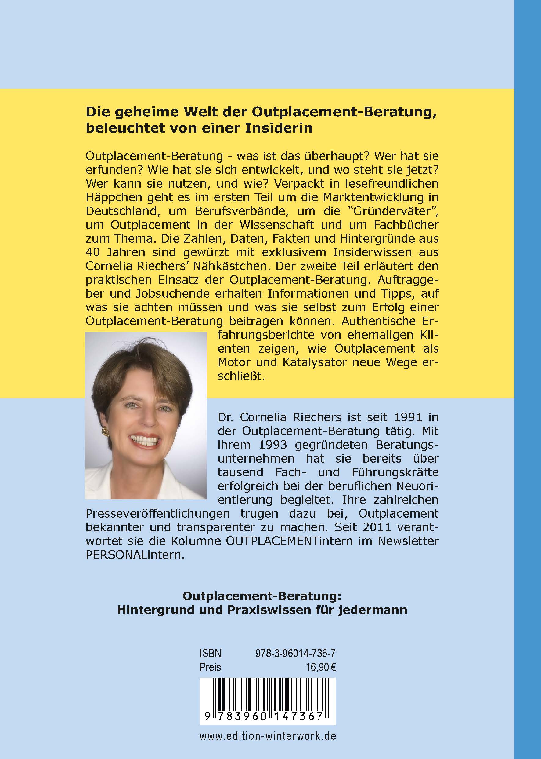Dr. Cornelia Riechers ist seit 1991 in der Outplacement-Beratung tätig. Mit ihrem 1993 gegründeten Beratungsunternehmen hat sie bereits über tausend Fach- und Führungskräfte erfolgreich bei der beruflichen Neuorientierung begleitet. Ihre zahlreichen Presseveröffentlichungen trugen dazu bei, Outplacement bekannter und transparenter zu machen. Seit 2011 verantwortet sie die Kolumne OUTPLACEMENTintern im Newsletter PERSONALintern. In ihrem ersten Buch "So bleiben Sie erfolgreich arbeitslos. Ein paradoxer Bewerbungsratgeber" verarbeitet sie häufige Bewerberfehler auf humorvolle Art und Weise. Im zweiten Buch "Turbo zum Traumjob: Der Zielgruppenbrief" zeigt sie, wie man es richtig macht. In ihrem Mini E Book AKarrierecoach gesucht? So erkennen Sie schwarze Schafe und finden den Richtigen@ enthüllt sie die Inkompetenz mancher Berater und gibt Tipps, wie Ratsuchende die Qualität des Coaches testen können. Mit ihrem vierten Buch AArbeitszeugnis selbst schreiben: Booster für Ihre Bewerbung@ trägt Riechers der Tatsache Rechnung, dass Mitarbeiter heute oft gezwungen sind, ihre Arbeitszeugnisse selbst zu entwerfen - da sie andernfalls riskieren, dass ihr Arbeitgeber sie mit einem 08/15-Zeugnis abspeist, das von einer Computersoftware erstellt wurde. Riechers‘ vorliegendes neuestes Buch „OUTPLACEMENTintern – 40 Jahre Outplacement-Beratung in Deutschland“ beleuchtet die geheime Welt der Outplacement-Beratung aus Sicht einer Insiderin. Zudem bietet es Arbeitgebern und Arbeitnehmern umfangreiches Praxiswissen über den Einsatz von Outplacement-Beratung. www.karriere mit vision.de/autorin/
