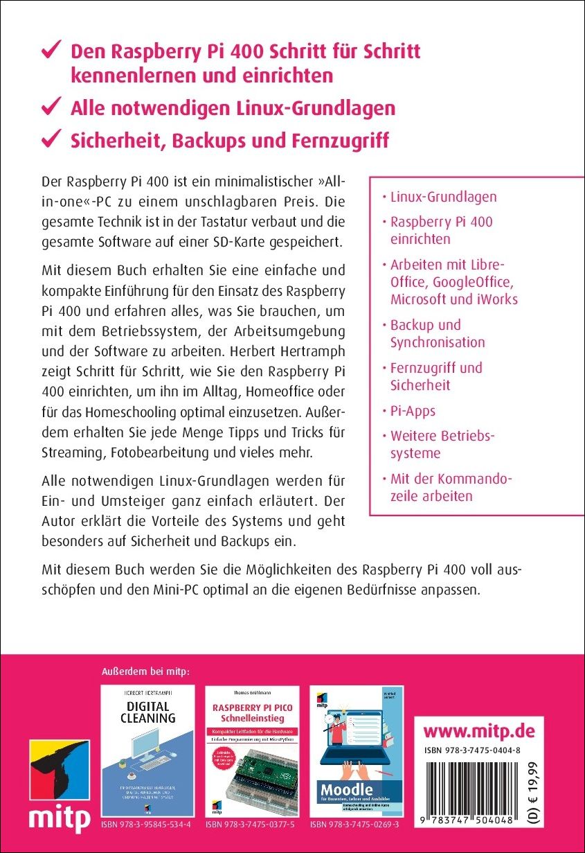 | Schlagworte | Anleitung • Arbeiten • Betriebssystem • Bluetooth • Buch • Computer • computer für schüler • günstiger computer • günstiger pc • Hardware • Homeoffice • Homeschooling • Linux • Maker • mitp • Office • PC • pc für schüler • Raspberry Pi • raspberry pi 400 • Raspi • RPi • rpi 400 • Software • USB |