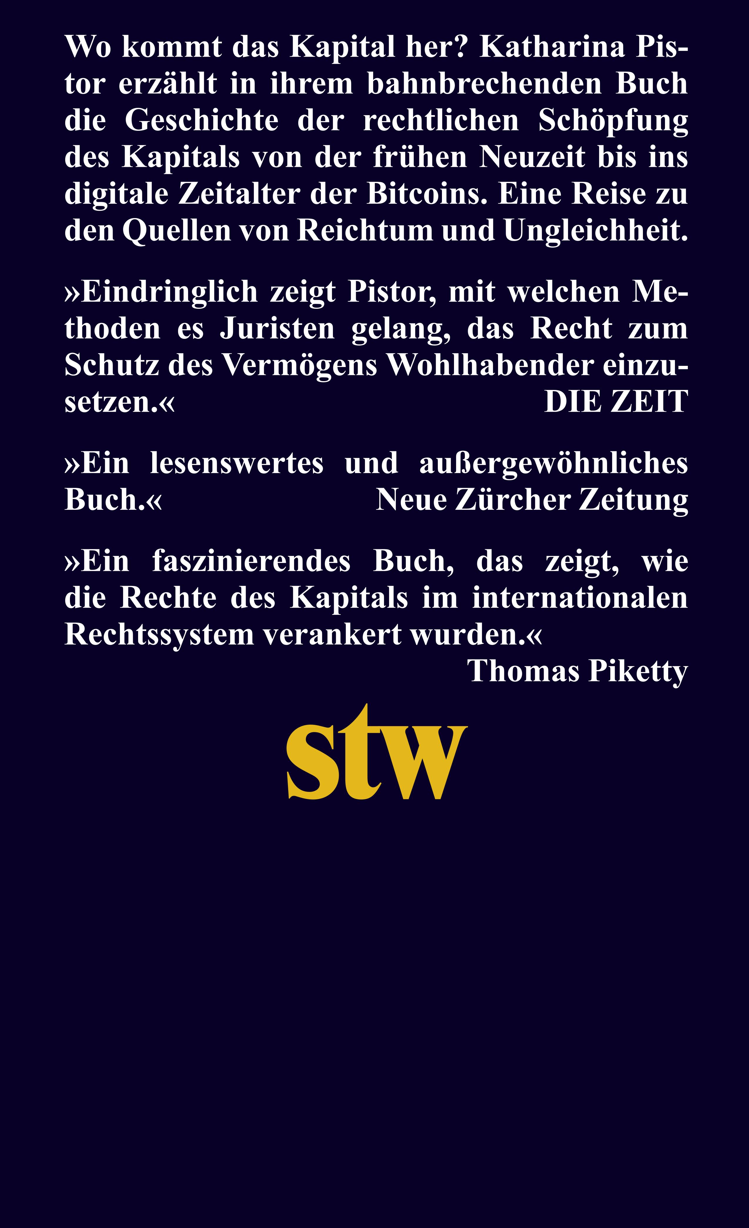 »In einem der vielleicht wichtigsten Sachbücher des Jahrzehnts wirft Katharina Pistor ein klares und scharfes Licht auf die Art und Weise, wie Rechtsordnungen die Konturen des wirtschaftlichen Handelns und des Eigentums im gegenwärtigen globalen Kapitalismus prägen.«