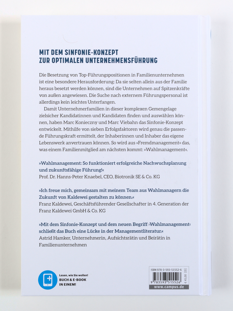 Damit Unternehmerfamilien in dieser komplexen Gemengelage zielsicher Kandidatinnen und Kandidaten finden und auswählen können, haben Marc Konieczny und Marc Viebahn das Sinfonie-Konzept entwickelt. Mithilfe von sieben Erfolgsfaktoren wird genau die passende Führungskraft ermittelt, der Inhaberinnen und Inhaber das eigene Lebenswerk anvertrauen können. So wird aus »Fremdmanagement« das, was einem Familienmitglied am nächsten kommt: »Wahlmanagement«.