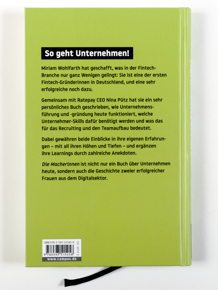 Miriam Wohlfarth hat geschafft, was in der Fintech-Branche nur ganz Wenigen gelingt: Sie ist eine der ersten Fintech-Gründerinnen in Deutschland, und eine sehr erfolgreiche noch dazu. Gemeinsam mit Ratepay CEO Nina Pütz hat sie ein sehr persönliches Buch geschrieben, wie Unternehmensführung und -gründung heute funktioniert, welche Unternehmer-Skills dafür benötigt werden und was das für das Recruiting und den Teamaufbau bedeutet.Dabei gewähren beide Einblicke in ihre eigenen Erfahrungen - mit all ihren Höhen und Tiefen - und ergänzen ihre Learnings durch zahlreiche Anekdoten.