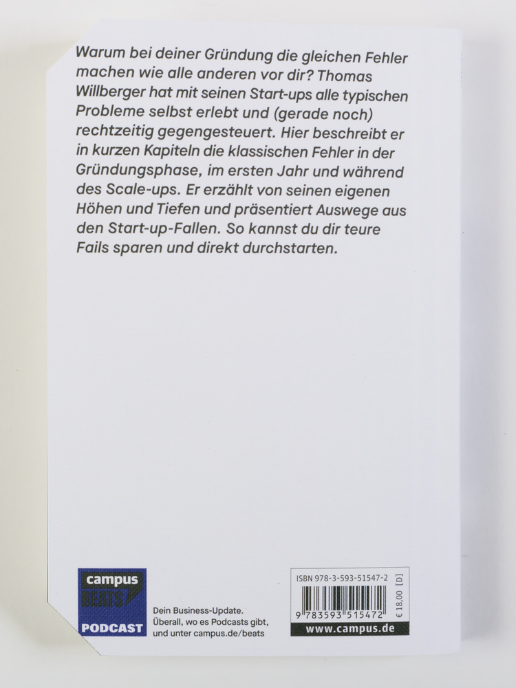 Warum bei deiner Gründung die gleichen Fehler machen wie alle anderen vor dir? Thomas Willberger hat mit seinen Start-ups alle typischen Probleme selbst erlebt und (gerade noch) rechtzeitig gegengesteuert. Hier beschreibt er in kurzen Kapiteln die klassischen Fehler in der Gründungsphase, im ersten Jahr und während des Scale-ups. Er erzählt von seinen eigenen Höhen und Tiefen und präsentiert Auswege aus den Start-up-Fallen. So kannst du dir teure Fails sparen und direkt durchstarten.