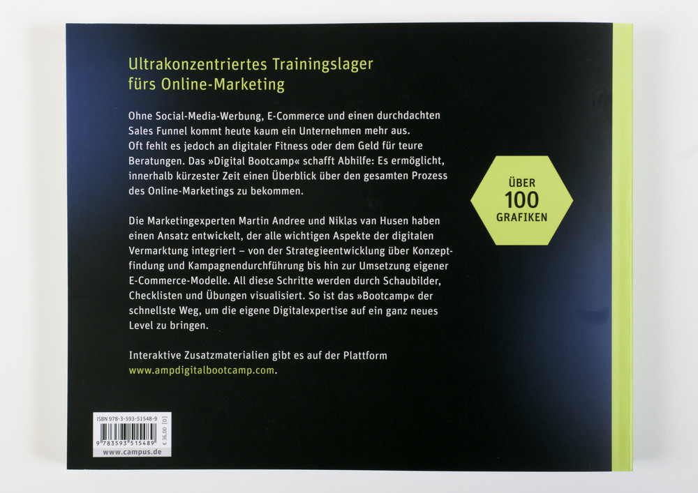 Die Marketingexperten Martin Andree und Niklas van Husen haben einen Ansatz entwickelt, der alle wichtigen Aspekte der digitalen Vermarktung integriert – von der Strategieentwicklung über Konzeptfindung und Kampagnendurchführung bis hin zur Umsetzung eigener E-Commerce-Modelle. All diese Schritte werden durch Schaubilder, Checklisten und Übungen visualisiert. So ist das »Bootcamp« der schnellste Weg, um die eigene Digitalexpertise auf ein ganz neues Level zu bringen.