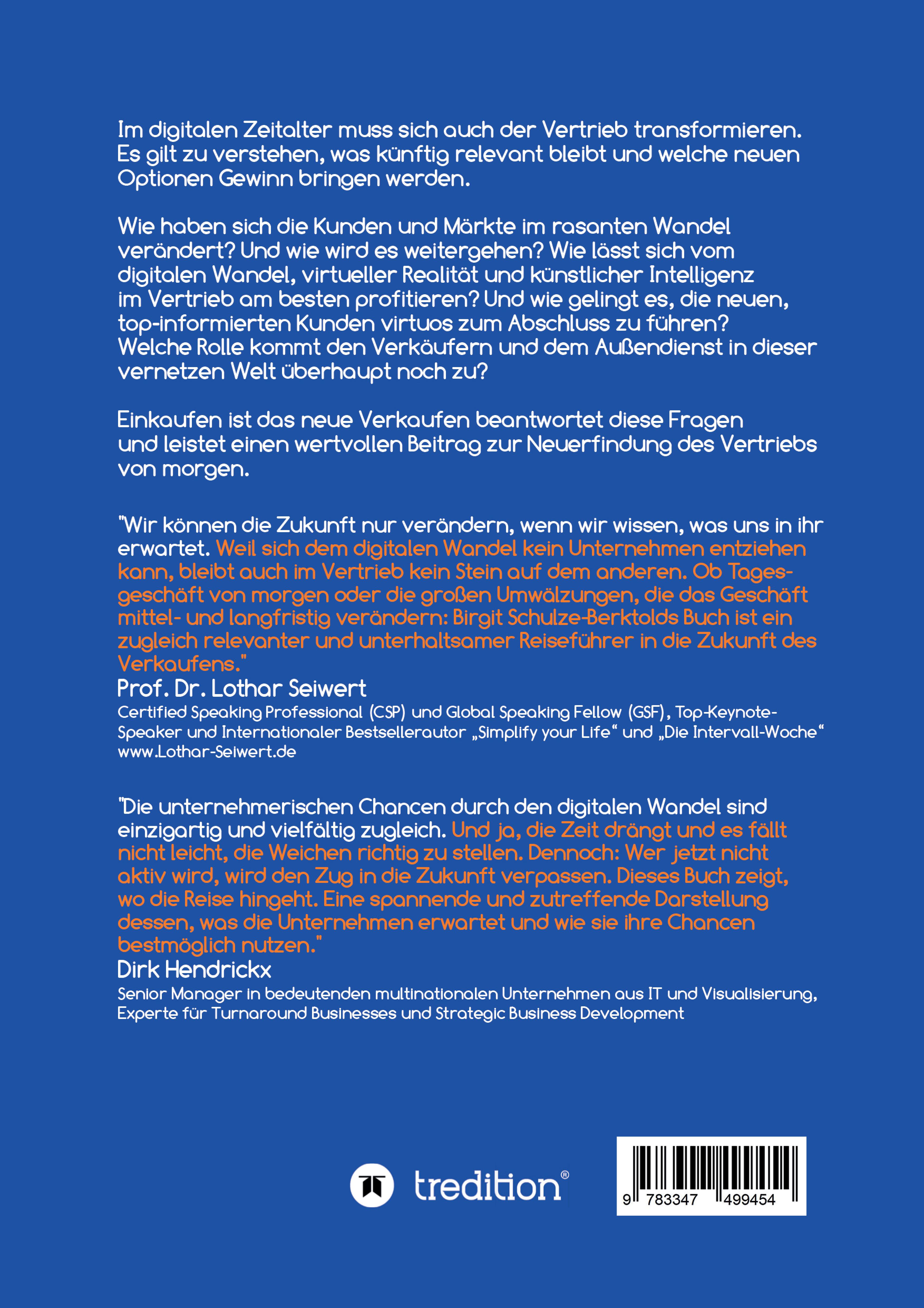 Dem Vertrieb steht mit dem digitalen Wandel nicht weniger als eine Revolution ins Haus. Die damit verbundene Mammutaufgabe beginnt schon im Kopf. Egal, wie sich die Welt in den letzten Jahren verändert hat: Das Geschäft selbst blieb mehr oder minder das gleiche, und der klassische Verkäufer unangetastet. Mit dem digitalen Quantensprung hat diese trügerische Stabilität ein Ende gefunden, weiß Einkaufen ist das neue Verkaufen. Als Vertriebsfrau der ersten Stunde und heutige Expertin in Sachen Vertrieb hat die Autorin den Wandel miterlebt und mitgestaltet. "Wer das Morgen gestalten will, muss das Gestern verstehen und wissen, was noch das Zeug für die Zukunft hat und was nicht." Davon ist Birgit Schulze-Berktold überzeugt "Es geht darum, wie sich der Markt verändert, was die Kunden heute und zukünftig wollen und wie sie nicht nur zeitgemäß, sondern im besten Fall der Zeit voraus bedient werden können." Zu den Themen gehören unter anderem die Perspektiven des Außendiensts und die Frage, wie sich klassischer Vertrieb und Verkäufer neu erfinden müssen, um auf lange Sicht in der Poleposition des wichtigen Umsatzbringers bleiben zu können. Die Autorin nähert sich den komplexen Herausforderungen des digitalen Wandels im Erzählstil, mit vielen spannenden Geschichten, Begegnungen und eigenen Erlebnissen."Einkaufen ist das neue Verkaufen!" ist ein intelligenter, Mut machender und spannender Reisebegleiter in die Zukunft des Verkaufens - ein Reiseführer voller Fingerzeige für die lohnendsten Ziele im Vertrieb und den Unternehmenserfolg von morgen. Bei seinen Empfehlungen verliert er die Menschen und ihre Bedürfnisse in keiner Sekunde aus dem Blick. Als studierte Philosophin gehört dies zu Birgit Schulze-Berktolds Grundanliegen, nicht nur als Autorin, sondern insgesamt als Botschafterin eines neuen Zeitalters des Vertriebs.