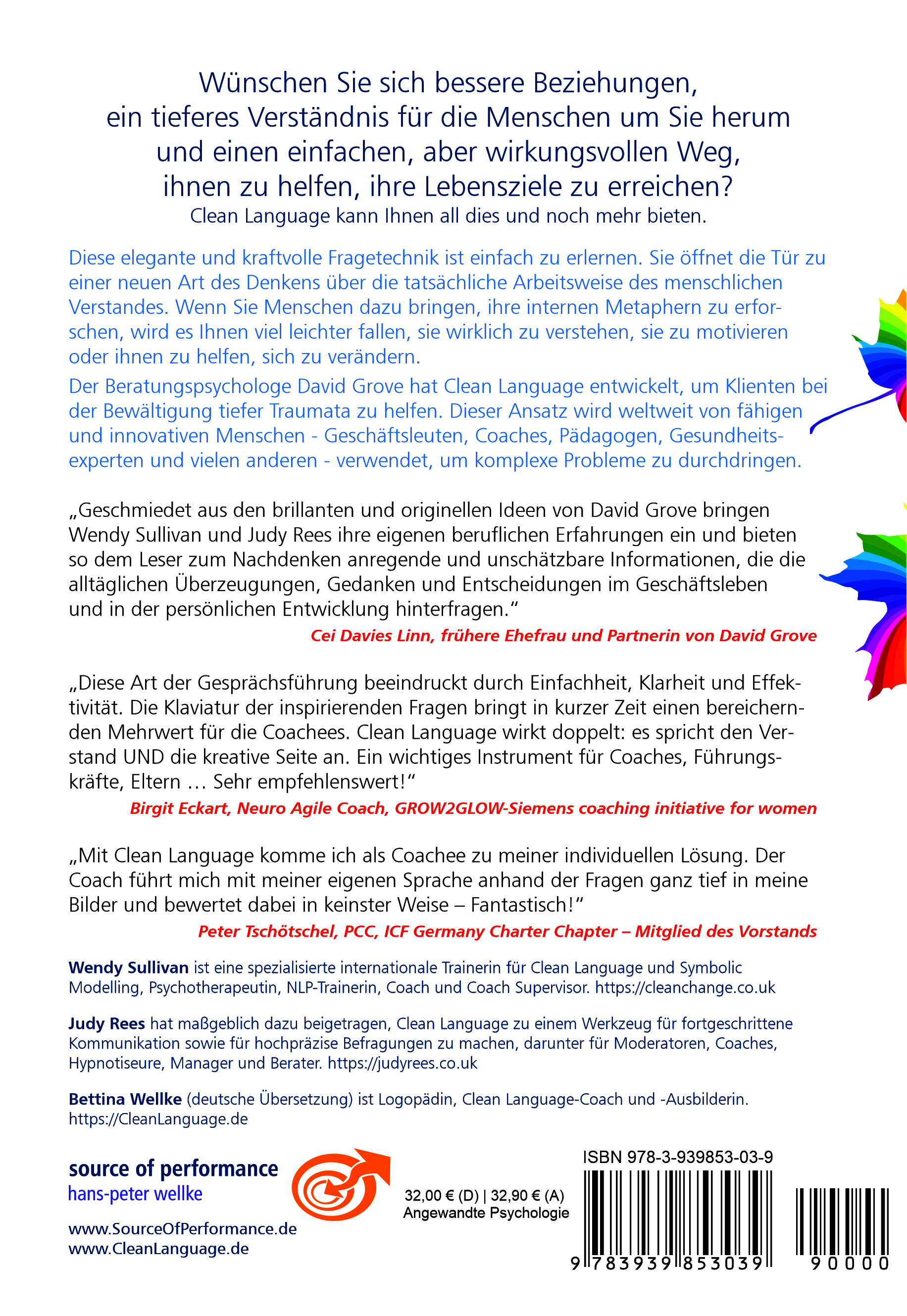| Schlagworte | agile coaching • Aktives Zuhören • Bettina Wellke • Caitlin Walker • cleanlanguage • Clean Language • Clean Language auf Deutsch • Coaching • David Grove • focussing • Fragetechnik • Gesprächsführung • Gewaltfreie Kommunikation • GFK • Hypnotherapie • Ideolektik • Interviewtechnik • James Lawley • Judy Rees • Klientenzentrierung • Kommunikation • Kreativitätstechnik • Lösung • Lösungsorientierung • Metapher • NLP • Nondirektive Gesprächsführung • Penny Tompkins • Psychologie • Psychotherapie • Symbolic Modelling • Systemische Beratung • Systemisches Coaching • Therapie • Wellke • Wendy Sullivan • Zuhören |