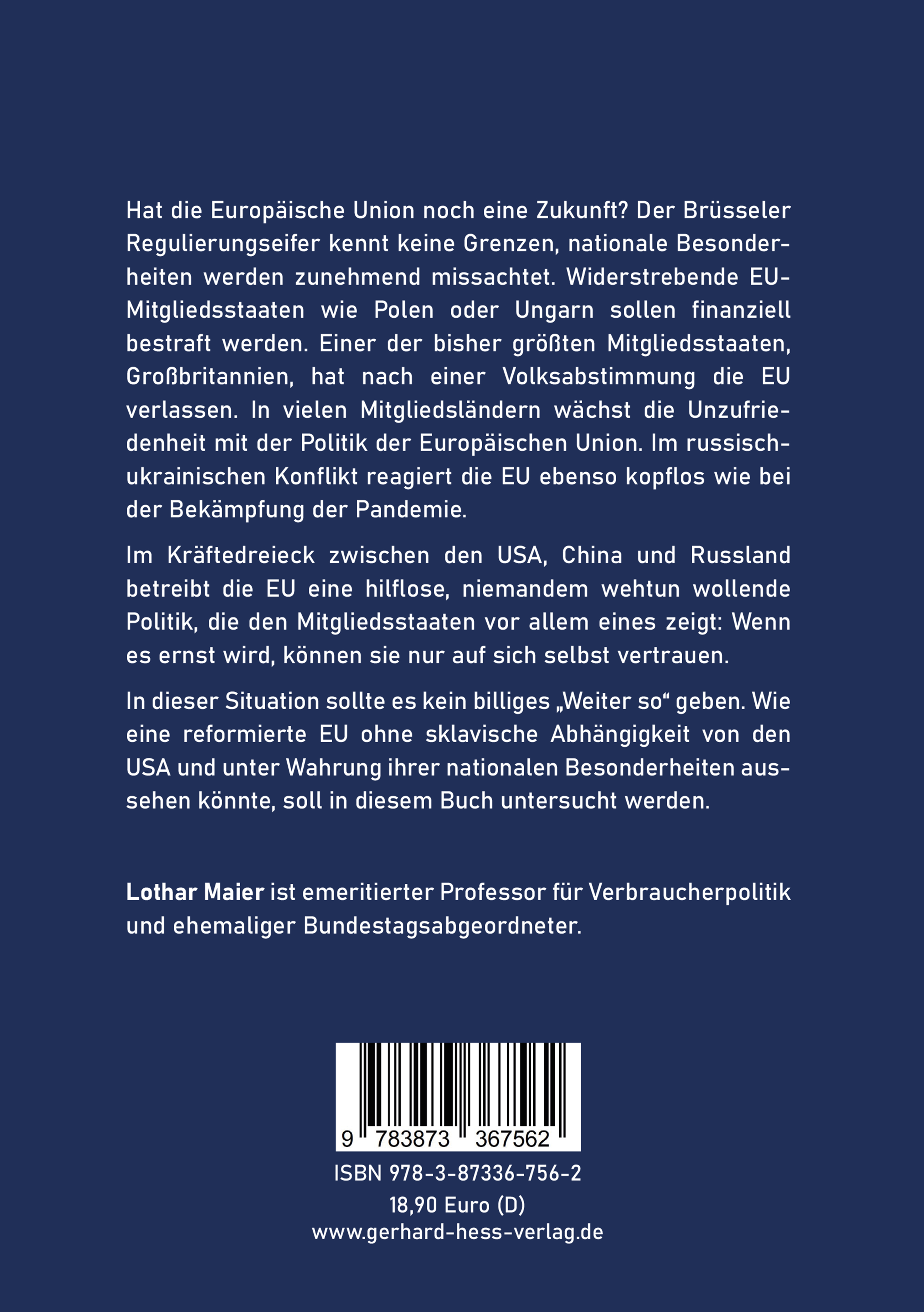 Hat die Europäische Union noch eine Zukunft? Der Brüsseler Regulierungseifer kennt keine Grenzen, nationale Besonderheiten werden zunehmend missachtet. Widerstrebende EU-Mitgliedsstaaten wie Polen oder Ungarn sollen finanziell bestraft werden. Einer der bisher größten Mitgliedsstaaten, Großbritannien, hat nach einer Volksabstimmung die EU verlassen. In vielen Mitgliedsländern wächst die Unzufriedenheit mit der Politik der Europäischen Union. Im russisch-ukrainischen Konflikt reagiert die EU ebenso kopflos wie bei der Bekämpfung der Pandemie. Im Kräftedreieck zwischen den USA, China und Russland betreibt die EU eine hilflose, niemandem wehtun wollende Politik, die den Mitgliedsstaaten vor allem eines zeigt: Wenn es ernst wird, können sie nur auf sich selbst vertrauen. In dieser Situation sollte es kein billiges "Weiter so" geben. Wie eine reformierte EU ohne sklavische Abhängigkeit von den USA und unter Wahrung ihrer nationalen Besonderheiten aussehen könnte, soll in diesem Buch untersucht werden. Lothar Maier ist emeritierter Professor für Verbraucherpolitik und ehemaliger Bundestagsabgeordneter.