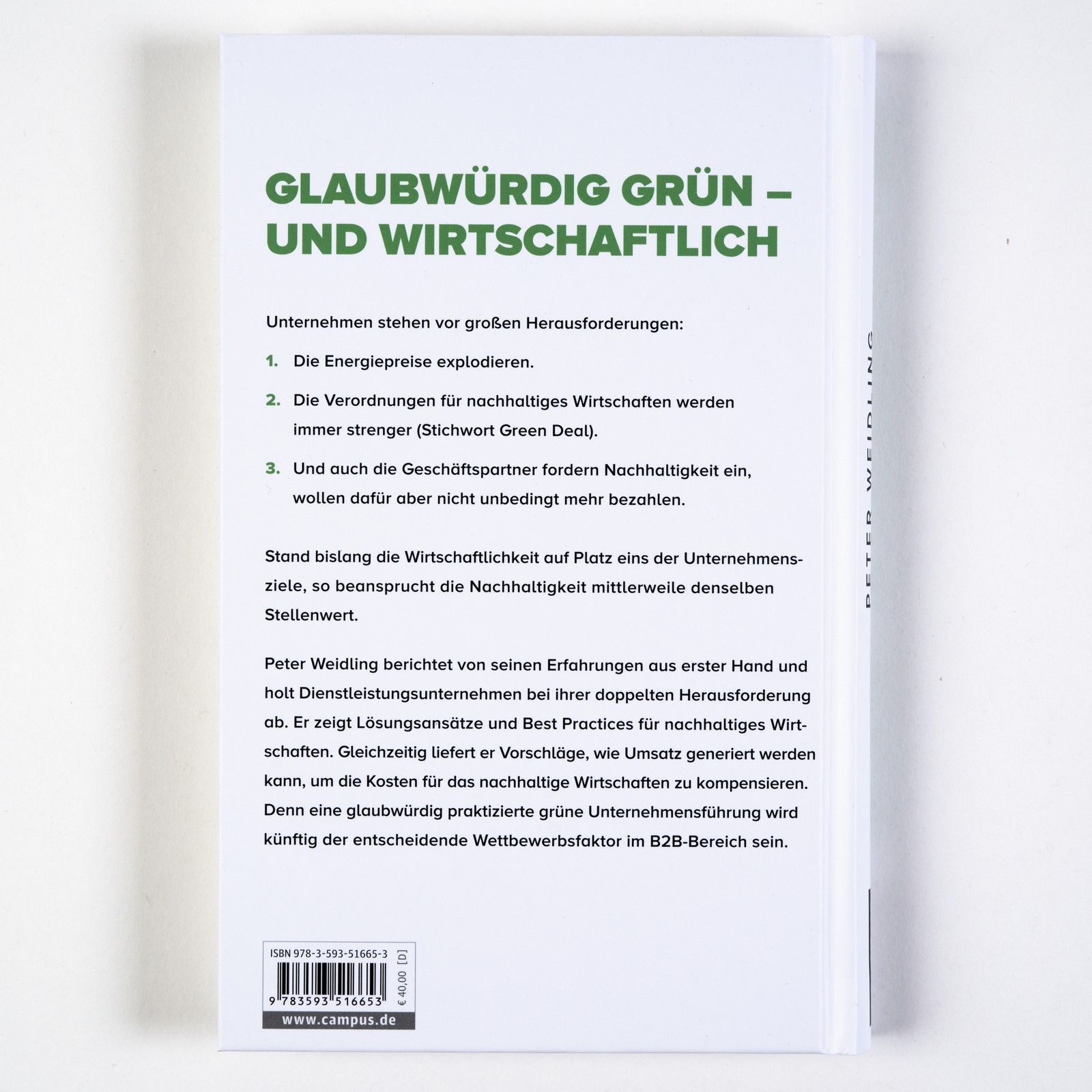 Peter Weidling holt die Unternehmen bei ihrer doppelten Herausforderung ab. Er zeigt Lösungsansätze und Best Practices zum nachhaltigen Wirtschaften für Dienstleistungsunternehmen – zum Beispiel wie der Service weitergedacht und mit innovativen Ideen verbessert werden kann. Gleichzeitig macht er Vorschläge, wie sich mehr Umsatz generieren lässt, um damit Kosten für nachhaltiges Wirtschaften zu kompensieren.
