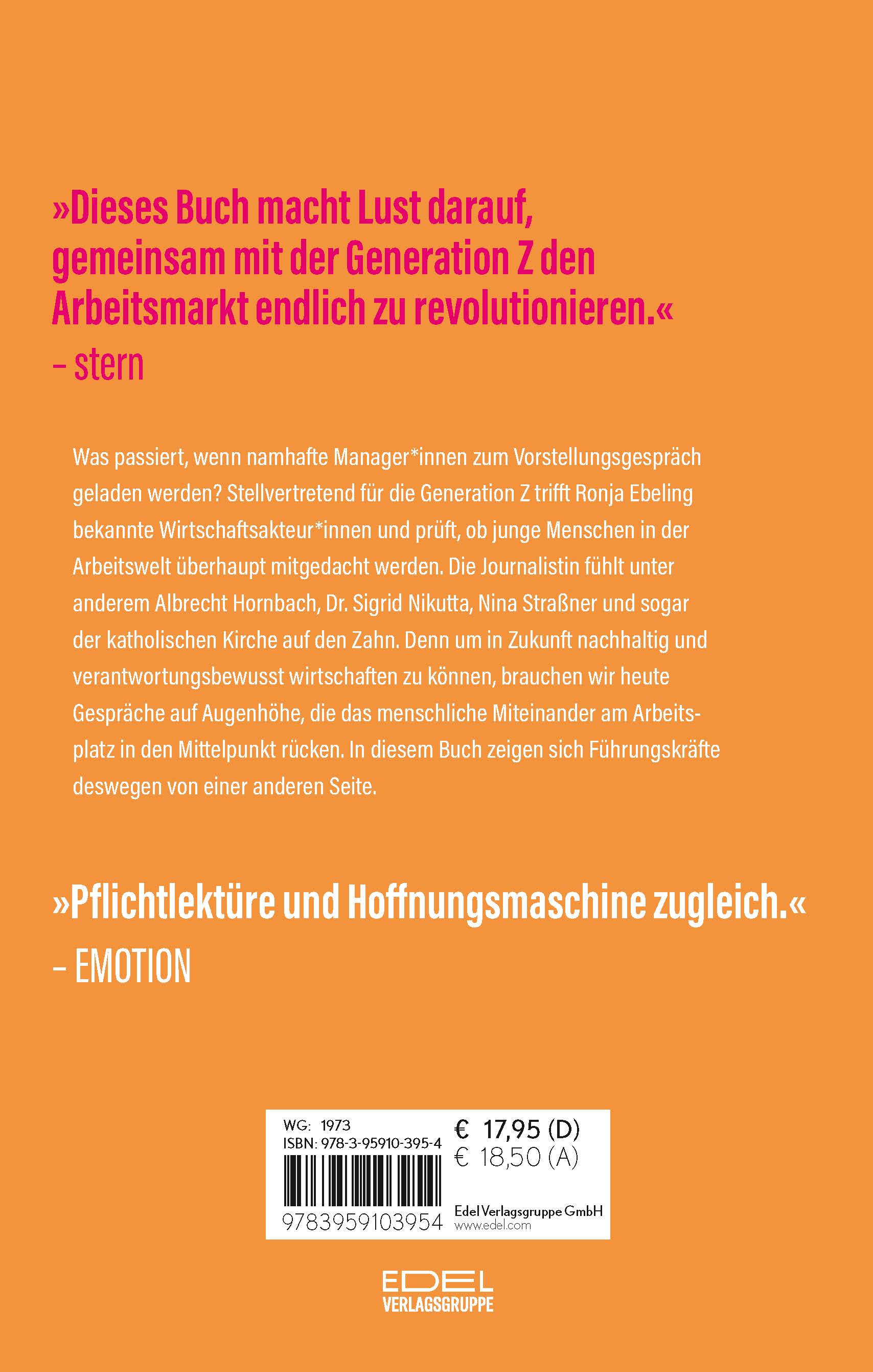 Stellvertretend für die Generation Z führt Ronja Ebeling Vorstellungsgespräche mit bekannten Wirtschaftsakteur*innen unseres Landes und prüft, ob junge Menschen in der Arbeitswelt überhaupt mitgedacht werden. Die Journalistin und Autorin fühlt unter anderem Albrecht Hornbach, Dr. Sigrid Nikutta (DB Cargo), Nina Straßner (SAP) und sogar der katholischen Kirche auf den Zahn. Denn um in Zukunft nachhaltig und verantwortungsbewusst wirtschaften zu können, brauchen wir heute Gespräche auf Augenhöhe, die das menschliche Miteinander am Arbeitsplatz in den Mittelpunkt rücken.