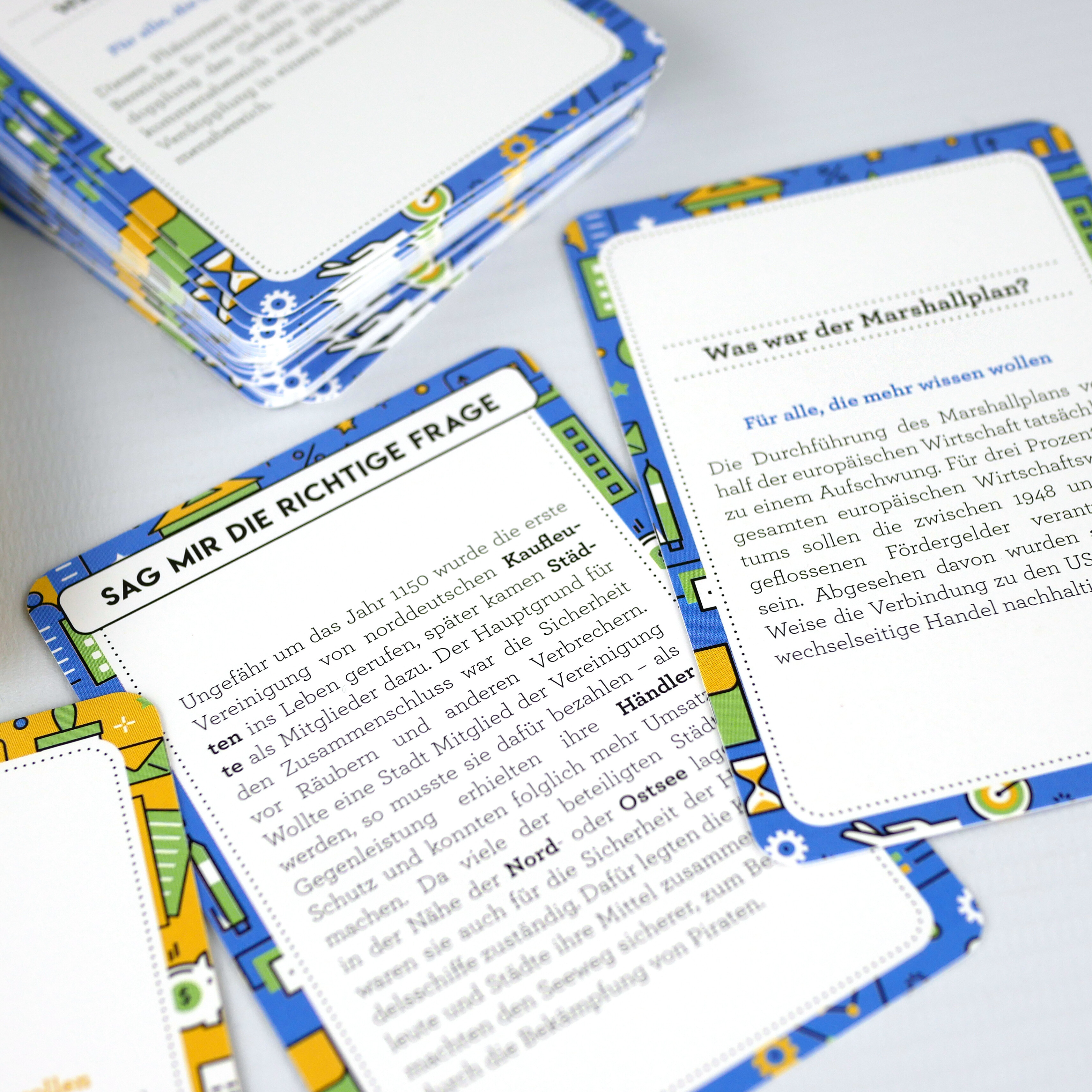 Wirtschaftliche Themen gehen uns alle an, doch es fällt nicht immer leicht, die Zusammenhänge zu verstehen. Oft sind die Erklärungen kompliziert und abschreckend. In diesem Quizspiel für die ganze Familie werden komplexe Sachverhalte rund um Geld, Aktien und Handel leicht verständlich erklärt. Zwei verschiedene Kartenvarianten sorgen außerdem für eine Menge Spielspaß. Findet ihr die richtigen Fragen für vorgegebene Antworten? Und tippt ihr auf die richtigen Antworten der spannenden Multiple-Choice-Fragen? Ob allein oder zusammen mit Freunden oder der Familie: Dieses Spiel sorgt für eine unterhaltsame Zeit!