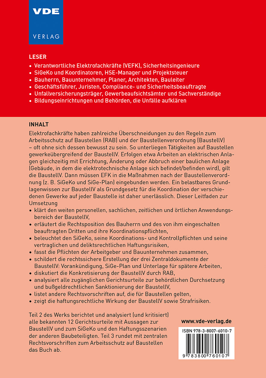 Handbuch für Elektrofachkräfte und Bauunternehmer, Architekten und Bauleiter, SiGeKo und Koordinatoren, HSE-Manager und Projektsteuerer, Sicherheitsingenieure und Sicherheitsbeauftragte