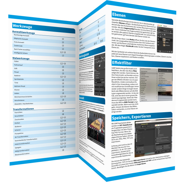 lt;p>Diese Kurzanleitung enthält die wichtigsten Informationen zur Bildbearbeitung in GIMP. Die praktische Faltkarte enthält die wichtigsten Tastaturkürzel zum Bearbeiten und Erstellen von Bildern und erklärt die wichtigsten Funktionen in bündiger und übersichtlicher Form.