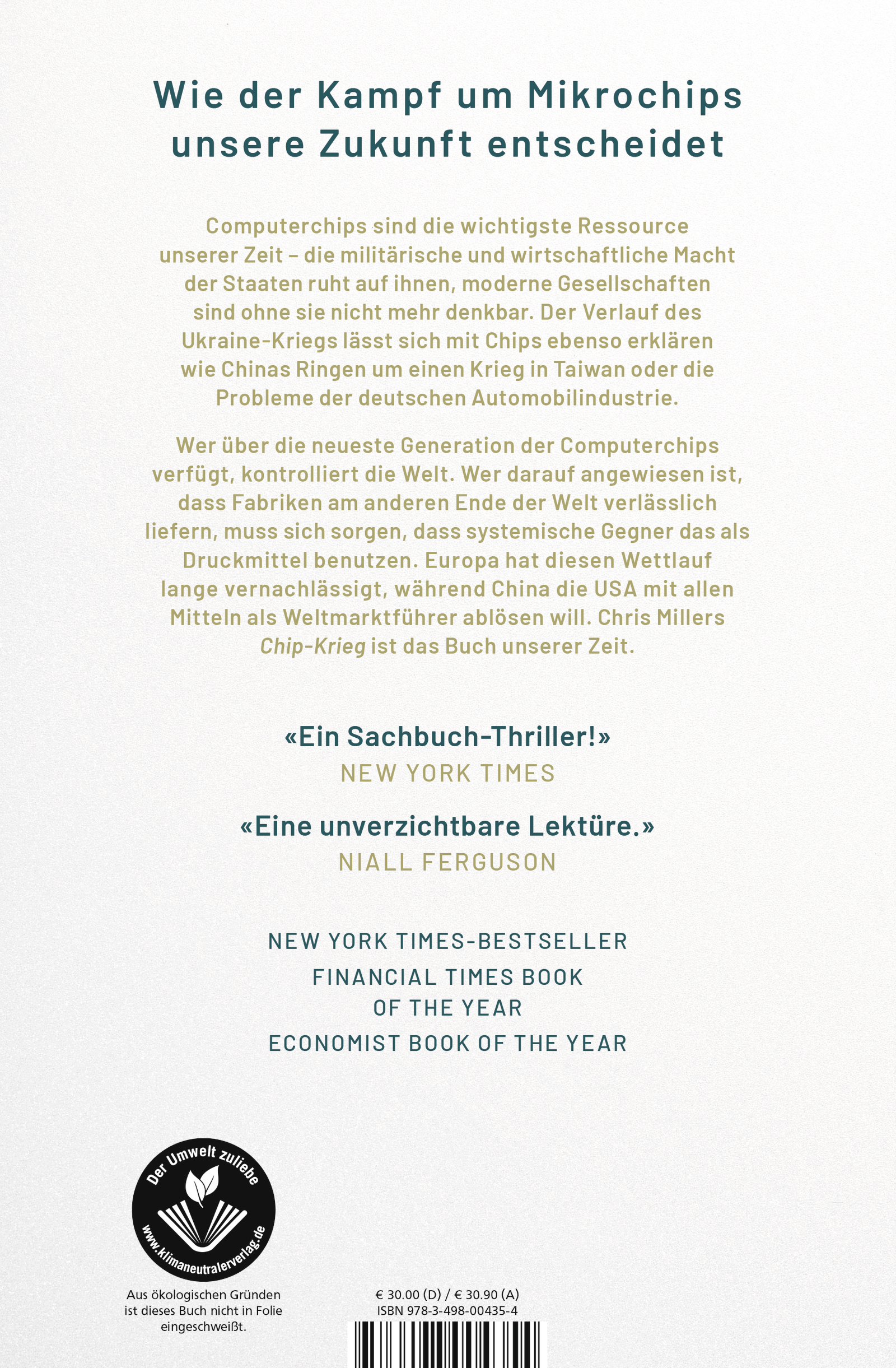 Chris Miller zeichnet in seinem Bestseller eindrucksvoll die Hintergründe im Wettlauf um die immer kleineren, immer leistungsstärkeren Chips nach: von den Anfängen der »digitalen Revolution« im später so getauften »Silicon Valley« über das Kräftemessen mit der Sowjetunion, die mit der Auslagerung der Produktion nach Südostasien einsetzende Globalisierung, bis hin zur technologischen Aufrüstung Chinas und der Chip-Krise während des Corona-Lockdowns: »Der Chip-Krieg« ist die erste vollumfängliche Geschichte der wohl wichtigsten Ressource unserer Zeit. Dabei wird klar: Wer den Zugang zu ihr kontrolliert, kontrolliert die Welt.