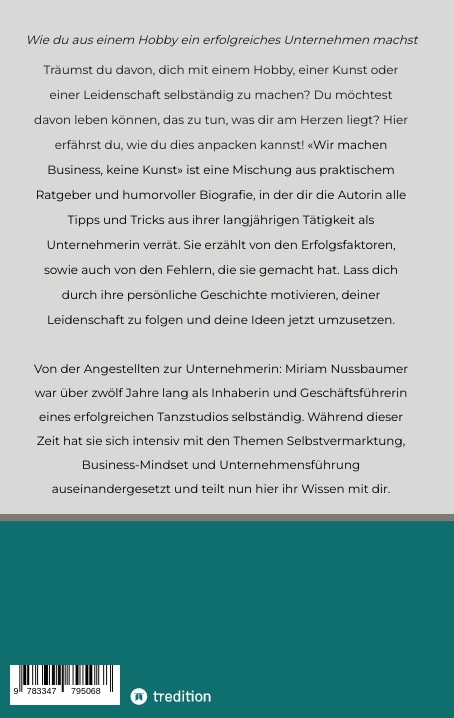 Du möchtest deine Leidenschaft zum Beruf machen und davon leben können? Hier erfährst du, wie du dies anpacken kannst!Die Autorin verrät dir alle Tipps und Tricks aus ihrer langjährigen Tätigkeit als Unternehmerin und erzählt dir von den Erfolgsfaktoren, aber auch von den Fehlern, die sie gemacht hat. Lass dich von ihren persönlichen Geschichten motivieren, deiner Leidenschaft zu folgen und deine Ideen jetzt umzusetzen.«Wir machen Business, keine Kunst» ist eine Mischung aus praktischem Ratgeber und humorvoller Biografie als Inspiration für Gründer*innen, die wissen möchten, welchen Herausforderungen Unternehmer*innen begegnen und wie sie diese meistern können.