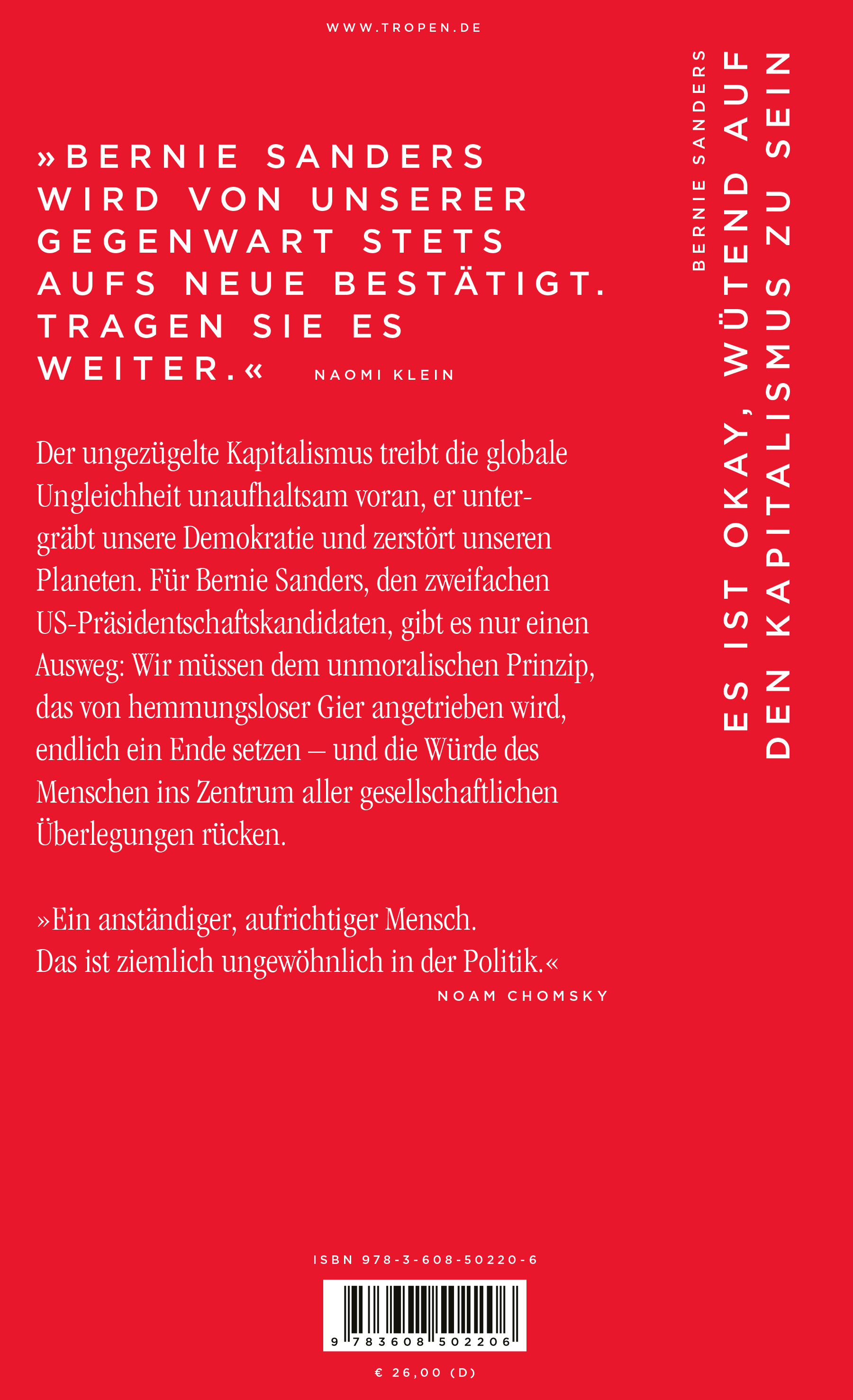 Laut Bernie Sanders haben wir Grund genug, wütend auf den Kapitalismus zu sein. Mehr noch: Unsere Wut ist der erste Schritt in eine neue Zukunft. Wir müssen anerkennen, dass wirtschaftliche Rechte Menschenrechte sind, und eine Gesellschaft schaffen, die einen angemessenen Lebensstandard für alle bietet. Denn wie schon Franklin D. Roosevelt sagte: »Echte individuelle Freiheit kann es ohne wirtschaftliche Absicherung und Unabhängigkeit nicht geben.«