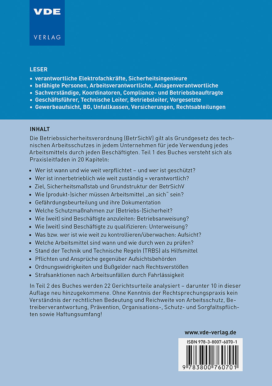Die Betriebssicherheitsverordnung (BetrSichV) gilt als Grundgesetz des technischen Arbeitsschutzes in jedem Unternehmen für jede Verwendung jedes Arbeitsmittels durch jeden Beschäftigten. Teil 1 des Buches versteht sich als Praxisleitfaden in 20 Kapiteln:- Wer ist wann und wie weit verpflichtet - und wer ist geschützt?- Wer ist innerbetrieblich wie weit zuständig = verantwortlich?- Ziel, Sicherheitsmaßstab und Grundstruktur der BetrSichV- Wie (produkt-)sicher müssen Arbeitsmittel "an sich" sein?- Gefährdungsbeurteilung und ihre Dokumentation- Welche Schutzmaßnahmen zur (Betriebs-)Sicherheit?- Wie (weit) sind Beschäftigte anzuleiten: Betriebsanweisung?- Wie (weit) sind Beschäftigte zu qualifizieren: Unterweisung?- Was bzw. wer ist wie weit zu kontrollieren/überwachen: Aufsicht?- Welche Arbeitsmittel sind wann und wie durch wen zu prüfen?- Stand der Technik und Technische Regeln (TRBS) als Hilfsmittel- Pflichten und Ansprüche gegenüber Aufsichtsbehörden- Ordnungswidrigkeiten und Bußgelder nach Rechtsverstößen- Strafsanktionen nach Arbeitsunfällen durch FahrlässigkeitIn Teil 2 des Buches werden 22 Gerichtsurteile analysiert - darunter 10 in dieser Auflage neu hinzugekommene. Ohne Kenntnis der Rechtsprechungspraxis kein Verständnis der rechtlichen Bedeutung und Reichweite von Arbeitsschutz, Betreiberverantwortung, Prävention, Organisations-, Schutz- und Sorgfaltspflichten sowie Haftungsumfang!