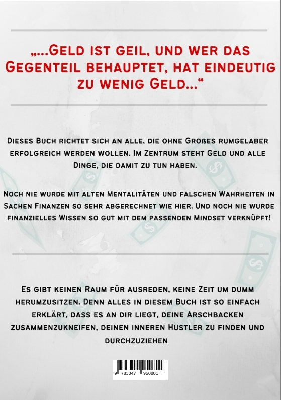 In diesem Buch werden alle Grundsteine gelegt, die man braucht, um mit einem passenden Mindset in das Thema Finanzen eingehen zu können. Beginnend dabei, was Geld ist und warum wir daran glauben, baut das Buch langsam mehr und mehr Wissen auf und überfordert den Leser nie. Durch die einfachen Erklärungen werden auch Themen wie Inflation und Mietendeckel betrachtet und leicht verständlich, sodass die praxisrelevanteren Themen wie Investieren, Versicherungen und >> wie kann ich Geld verdienen?<< im späteren Teil des Buches auf diese Grundlagen aufbauen können. Mindset und vor allem vergängliche Mentalitätenwerden auch in jedem Kapitel angerissen, bis alle alten Ideen im letzten Kapitel eingerissen werden und das Mindset endgültig gefestigt wird. Kein Blatt wird vor den Mund genommen und keine Sekunde gespart, um dich lächerlich zu machen, während du immer noch dein Geld auf einem Sparbuch anlegst. Im großen und Ganzen ist dieses Buch wie ein Trampelpfad über das Thema Finanzen und nimmt sich nie zu ernst. Reale Praxisbeispiele und Ideen bilden das Fundament jedes einzelnen Abschnittes und machen es dir auch möglich jeden Satz zu verstehen. Viel wichtiger noch: Alles ist so nah an der Realität wie es geht. Auch Themen wie Instagramm-Morgen-Routinen und kleine Tricks im Umgang mit deinen Mitmenschen stehen deshalb im Fokus. Nichts ist zu einseitig beschrieben und alles, sogar das Sparbuch, wurde von verschiedenen Standpunkten betrachtet. Trotzdem steht immer nur eine Sache im Zentrum: Geld, denn Geld ist Geil!