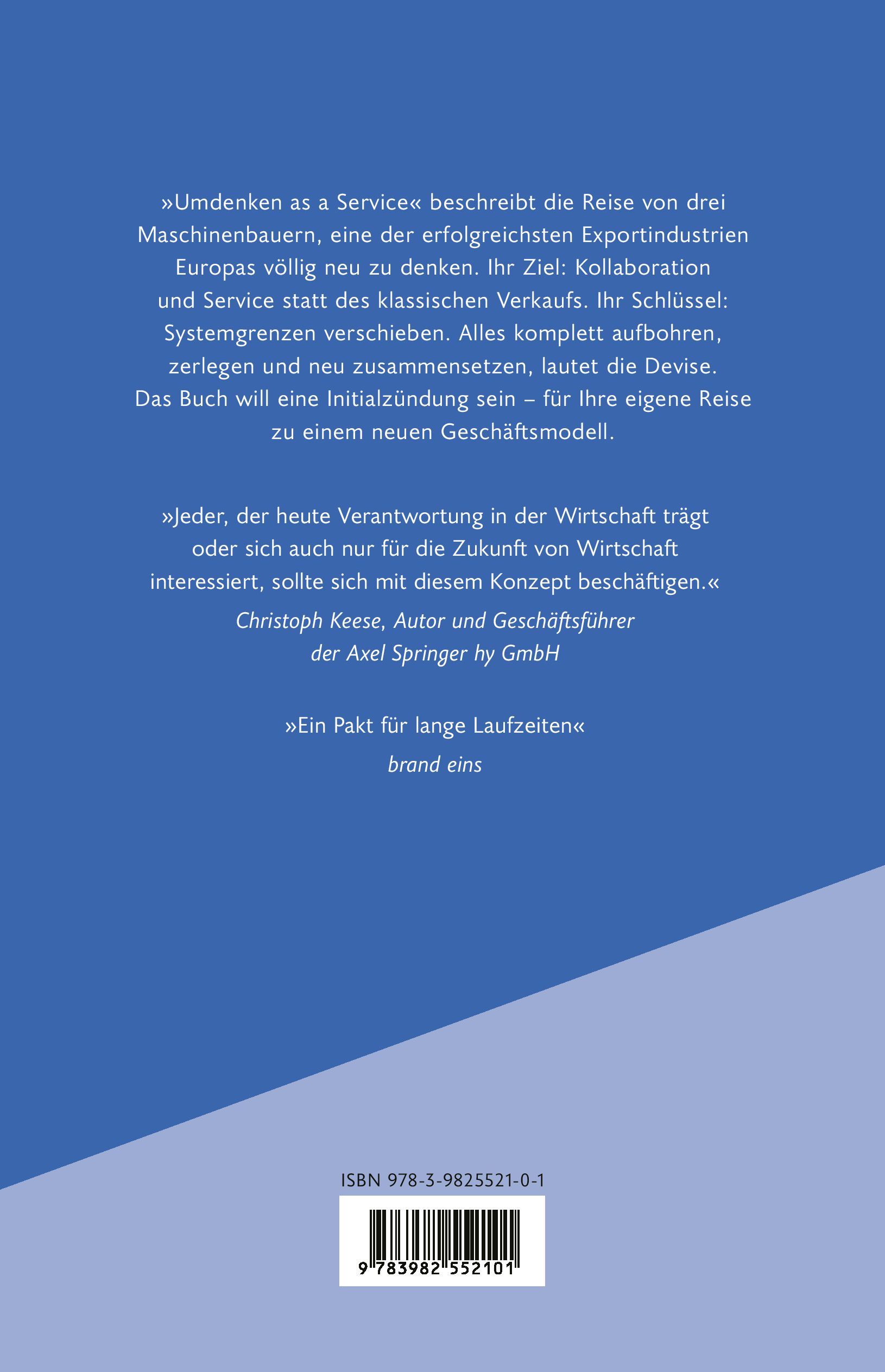 "Umdenken as a Service" beschreibt die Reise von drei Maschinenbauern, eine der erfolgreichsten Exportindustrien Europas völlig neu zu denken. Ihr Ziel: Kollaboration und Service statt des klassischen Verkaufs. Ihr Schlüssel: Systemgrenzen verschieben. Alles komplett aufbohren, zerlegen und neu zusammensetzen, lautet die Devise. Das Buch will eine Initialzündung sein – für Ihre eigene Reise zu einem neuen Geschäftsmodell.