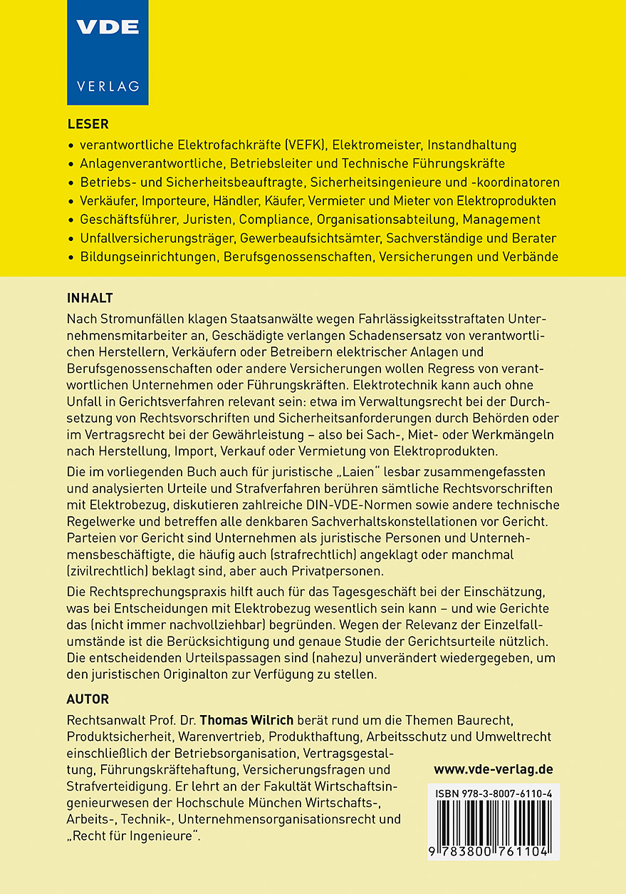 Nach Stromunfällen klagen Staatsanwälte wegen Fahrlässigkeitsstraftaten Unternehmensmitarbeiter an, Geschädigte verlangen Schadensersatz von verantwortlichen Herstellern, Verkäufern oder Betreibern elektrischer Anlagen und Berufsgenossenschaften oder andere Versicherungen wollen Regress von verantwortlichen Unternehmen oder Führungskräften. Elektrotechnik kann auch ohne Unfall in Gerichtsverfahren relevant sein: etwa im Verwaltungsrecht bei der Durchsetzung von Rechtsvorschriften und Sicherheitsanforderungen durch Behörden oder im Vertragsrecht bei der Gewährleistung - also bei Sach-, Miet- oder Werkmängeln nach Herstellung, Import, Verkauf oder Vermietung von Elektroprodukten.Die im vorliegenden Buch auch für juristische "Laien" lesbar zusammengefassten und analysierten Urteile und Strafverfahren berühren sämtliche Rechtsvorschriften mit Elektrobezug, diskutieren zahlreiche DIN-VDE-Normen sowie andere technische Regelwerke und betreffen alle denkbaren Sachverhaltskonstellationen vor Gericht. Parteien vor Gericht sind Unternehmen als juristische Personen und Unternehmensbeschäftigte, die häufig auch (strafrechtlich) angeklagt oder manchmal (zivilrechtlich) beklagt sind, aber auch Privatpersonen.Die Rechtsprechungspraxis hilft auch für das Tagesgeschäft bei der Einschätzung, was bei Entscheidungen mit Elektrobezug wesentlich sein kann - und wie Gerichte das (nicht immer nachvollziehbar) begründen. Wegen der Relevanz der Einzelfallumstände ist die Berücksichtigung und genaue Studie der Gerichtsurteile nützlich. Die entscheidenden Urteilspassagen sind (nahezu) unverändert wiedergegeben, um den juristischen Originalton zur Verfügung zu stellen.