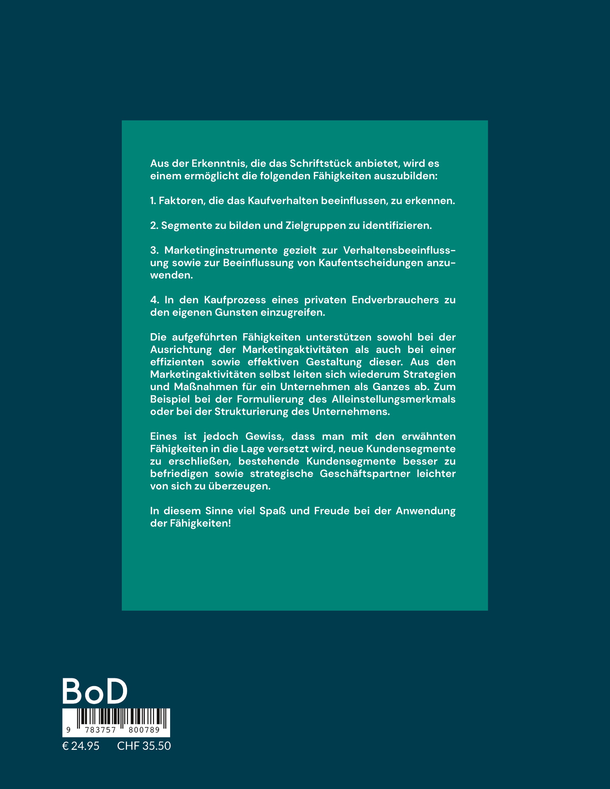 | Schlagworte | Entscheidungsverhalten • Gezielte Beeinflussung von Kaufentscheidungen • Gezielte Beeinflussung von Kaufverhalten • Kaufverhalten • Kaufverhalten privater Endverbraucher • Konsumenten • Konsumverhalten von Individuen • Marketing • Marketing und Vertrieb • Private Endverbraucher |