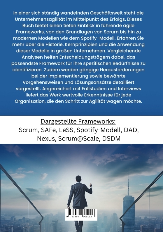 In einer sich ständig wandelnden Geschäftswelt steht die Unternehmensagilität im Mittelpunkt des Erfolgs. Dieses Buch bietet einen tiefen Einblick in führende agile Frameworks, von den Grundlagen von Scrum bis hin zu modernen Modellen wie dem Spotify-Modell. Erfahren Sie mehr über die Historie, Kernprinzipien und die Anwendung dieser Modelle in großen Unternehmen. Vergleichende Analysen helfen Entscheidungsträgern dabei, das passendste Framework für ihre spezifischen Bedürfnisse zu identifizieren. Zudem werden gängige Herausforderungen bei der Implementierung sowie bewährte Vorgehensweisen und Lösungsansätze detailliert vorgestellt. Angereichert mit Fallstudien und Interviews liefert das Werk wertvolle Erkenntnisse für jede Organisation, die den Schritt zur Agilität wagen möchte.Dargestellte Frameworks: Scrum, SAFe, LeSS, Spotify-Modell, DAD, Nexus, Scrum@Scale, DSDM
