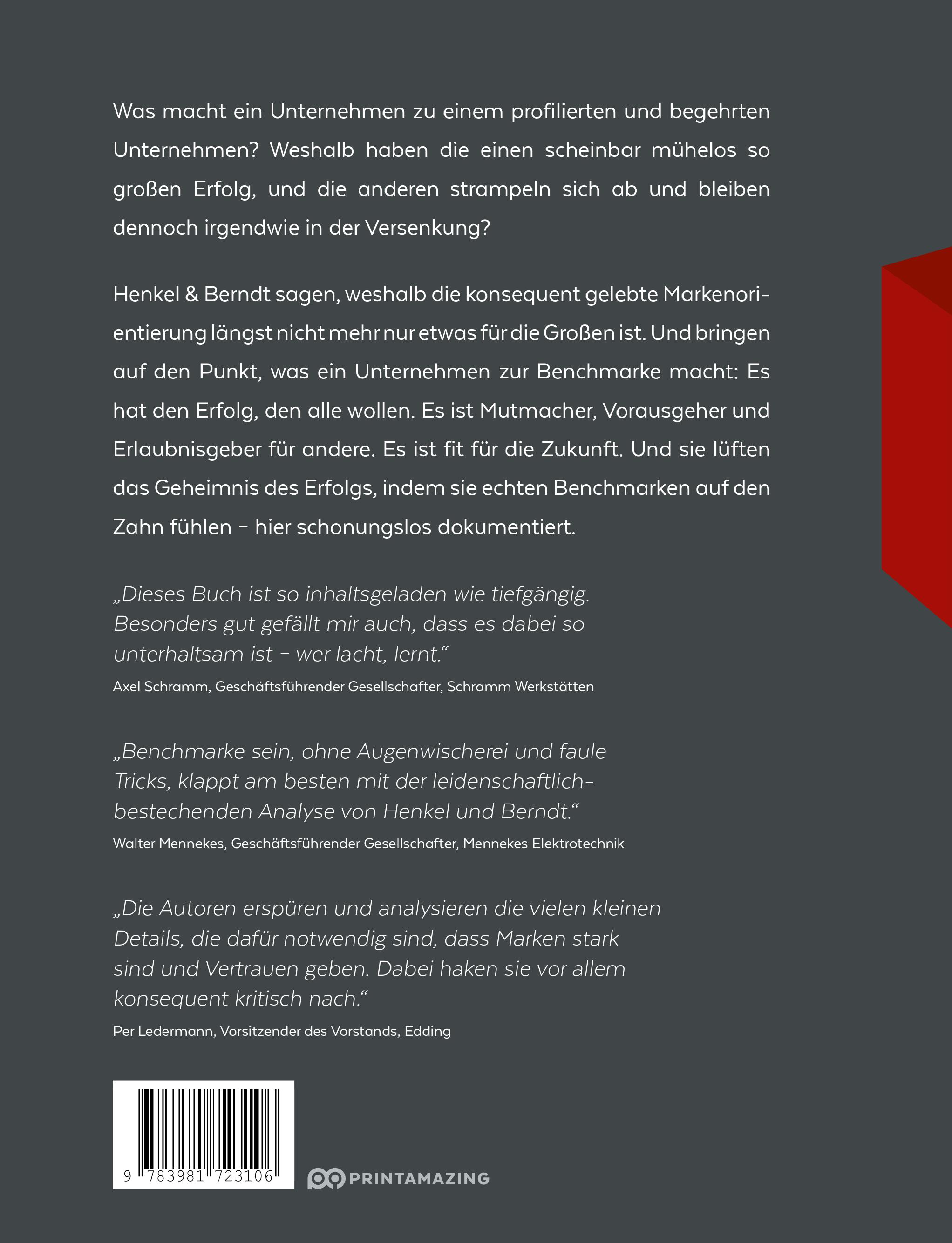 Was macht ein Unternehmen zu einem profilierten und begehrten Unternehmen? Weshalb haben die einen scheinbar mühelos so großen Erfolg, und die anderen strampeln sich ab und bleiben dennoch irgendwie in der Versenkung?Henkel & Berndt sagen, weshalb die konsequent gelebte Markenorientierung längst nicht mehr nur etwas für die Großen ist. Und bringen auf den Punkt, was ein Unternehmen zur Benchmarke macht: Es hat den Erfolg, den alle wollen. Es ist Mutmacher, Vorausgeher und Erlaubnisgeber für andere. Es ist fit für die Zukunft. Und sie lüften das Geheimnis des Erfolgs, indem sie echten Benchmarken auf den Zahn fühlen - hier schonungslos dokumentiert. Ausführlich kritisch recherchierte, dokumentierte und kommentierte Benchmarken-Insights liefern Henkel & Berndt u.a. über- Edding- Busch-Jaeger- Bünting Tee- Easy Credit- Kaldewei- Schramm Werkstätten- Wertgrund Immobilien- Hotel Castell- Arnold Metallverarbeitung