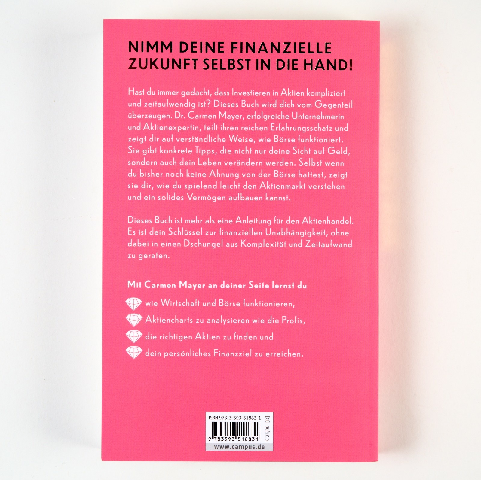 Mit ihrem Buch möchte Carmen Mayer vor allem Frauen ermutigen und sie mit konkreten Tipps unterstützen, sich mit den eigenen Geldangelegenheiten auseinanderzusetzen und sich ein Vermögen aufzubauen. Sie ist davon überzeugt, dass mit etwas Zeit und Mühe jeder Mensch finanziell unabhängig werden kann. Ihr eigener Werdegang zeigt, dass sich prinzipiell jeder den Wunsch von finanzieller Freiheit erfüllen kann - wenn man es sich nicht nur wünscht, sondern auch handelt.