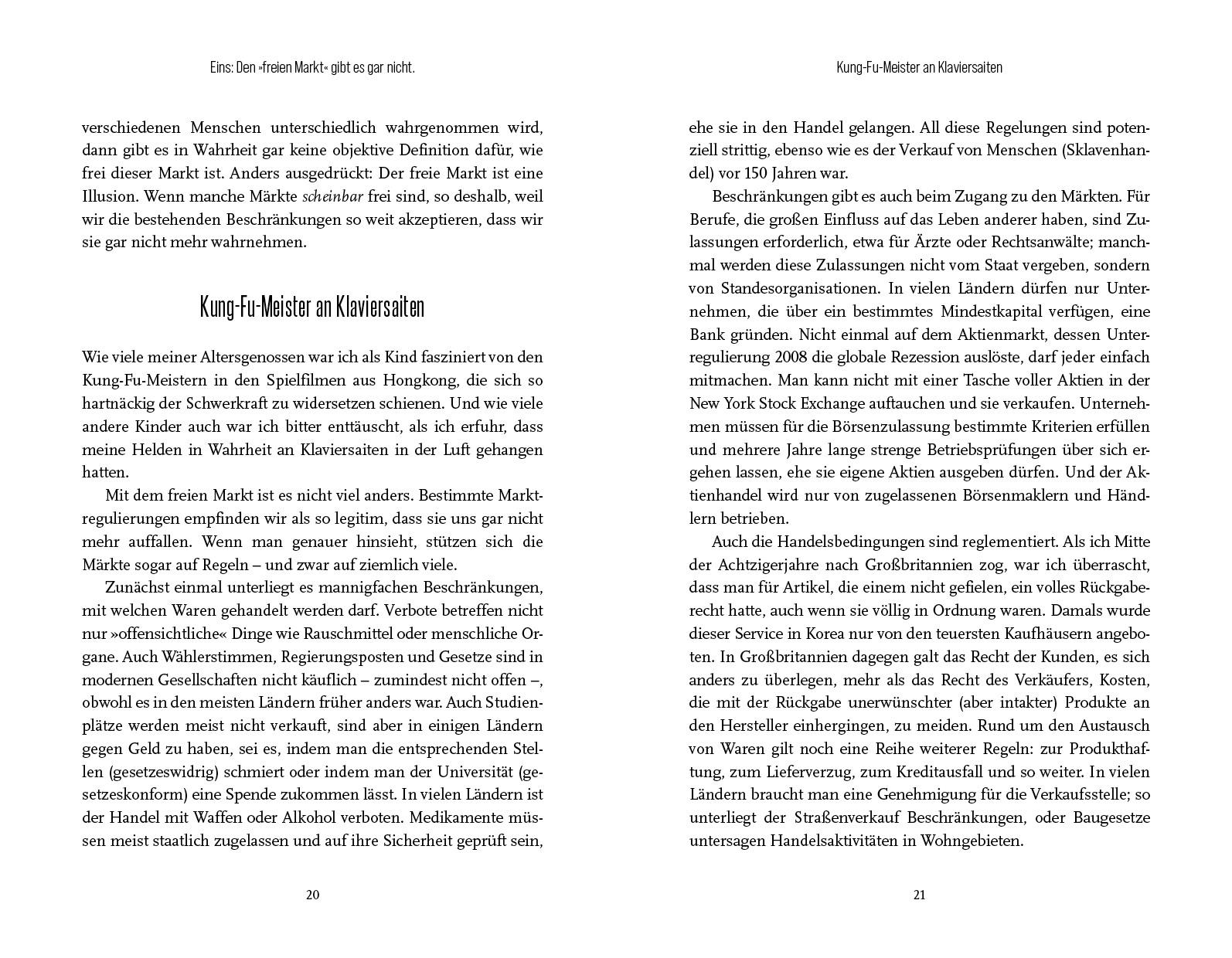 In seinem brillant geschriebenen Debattenbuch zerlegt Wirtschaftswissenschaftler Ha-Joon Chang einige der zentralen Mythen des Kapitalismus.Seit den 1980er-Jahren wird die Welt von der Ideologie des freien Marktes regiert. Wir hören, dass die Märkte, wenn man sie nur in Ruhe lässt, die effizientesten und gerechtesten Ergebnisse herbeiführen werden. Und Unternehmen, so heißt es, sollten maximale Freiheit erhalten. Denn wenn man sie nur gewähren lässt, wird der Wohlstand aufs Maximum anwachsen und auch dem Rest der Gesellschaft zugutekommen. Die meisten Länder sind diesem Ratschlag gefolgt, doch das Ergebnis dieser Politik war das genaue Gegenteil dessen, was man uns versprochen hatte.In 23 Thesen und Gegenthesen nimmt Ha-Joon Chang die Grundzüge der Marktwirtschaft des 21. Jahrhunderts unter die Lupe und erklärt, welche Möglichkeiten sie bietet, aber auch, wo ihre Grenzen liegen. Dabei vermag der preisgekrönte Wirtschaftswissenschaftler nicht nur die Sachverhalte kenntnisreich und messerscharf zu durchdringen, sondern sie zugleich auch noch dem Leser auf verständliche Weise nahezubringen, ohne dabei polemisch zu werden.Ein Muss für jeden Leser, der bislang das vage Gefühl hatte, dass der Kapitalismus nicht ausschließlich ein Segen für die Menschheit ist.
