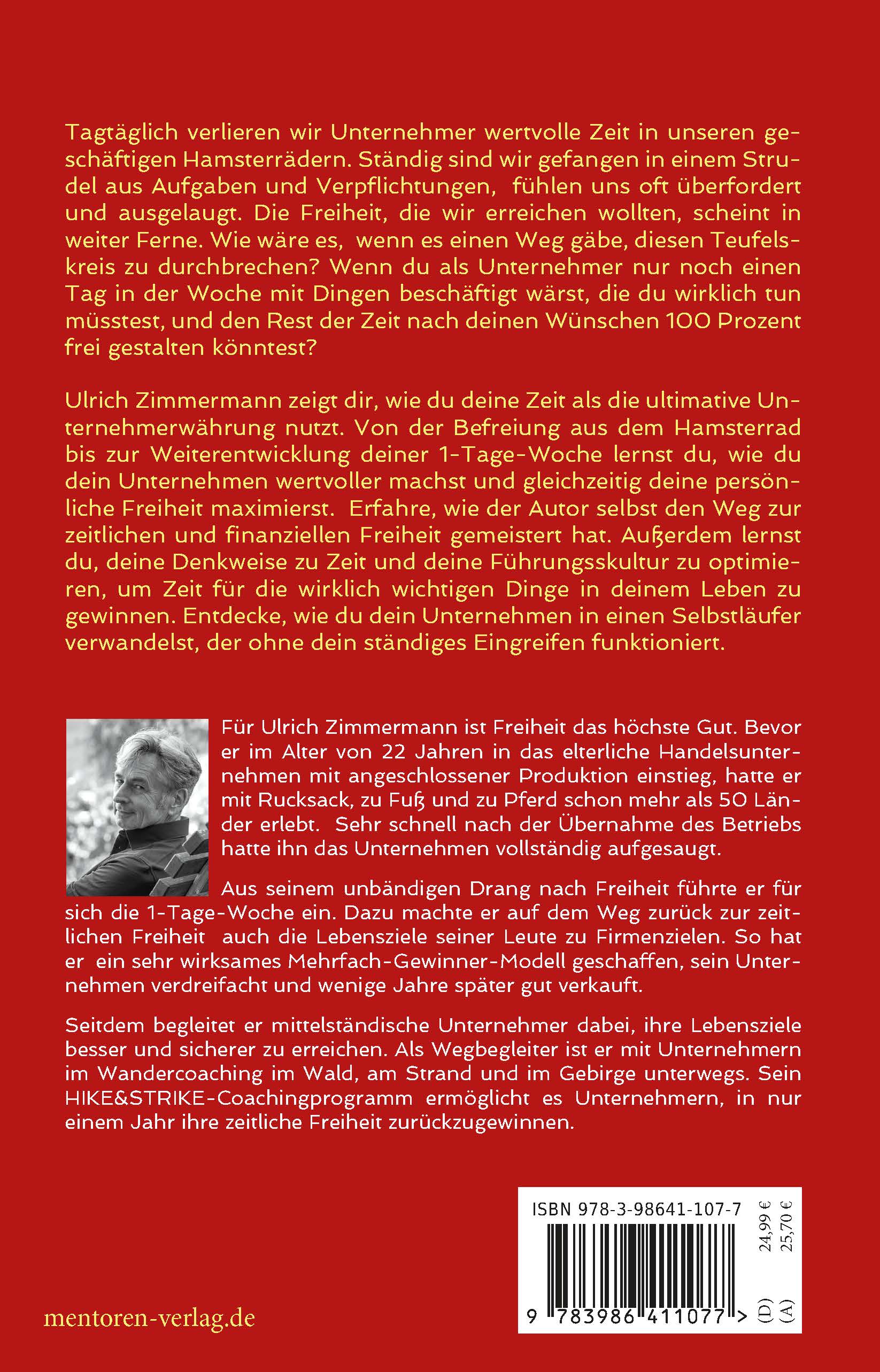 Für Ulrich Zimmermann ist Freiheit das höchste Gut. Bevor er im Alter von 22 Jahren in das elterliche Handelsunternehmen mit angeschlossener Produktion einstieg, hatte er mit Rucksack, zu Fuß und zu Pferd schon mehr als 50 Länder erlebt. Sehr schnell nach der Übernahme des Betriebs hatte ihn das Unternehmen vollständig aufgesaugt. Aus seinem unbändigen Drang nach Freiheit führte er für sich die 1-Tage-Woche ein. Dazu machte er auf dem Weg zurück zur zeitlichen Freiheit auch die Lebensziele seiner Leute zu Firmenzielen. So hat er ein sehr wirksames Mehrfach-Gewinner-Modell geschaffen, sein Unternehmen verdreifacht und wenige Jahre später gut verkauft. Seitdem begleitet er mittelständische Unternehmer dabei, ihre Lebensziele besser und sicherer zu erreichen. Als Wegbegleiter ist er mit Unternehmern im Wandercoaching im Wald, am Strand und im Gebirge unterwegs. Sein HIKE&STRIKE-Coachingprogramm ermöglicht es Unternehmern, in nur einem Jahr ihre zeitliche Freiheit zurückzugewinnen.