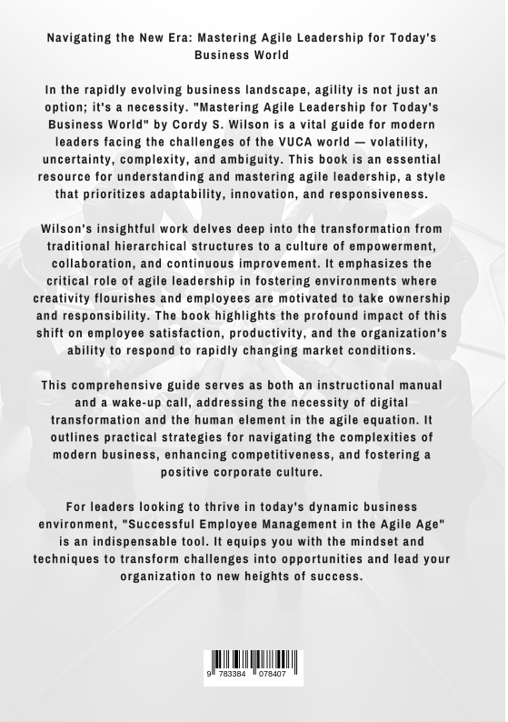 Navigating the New Era: Mastering Agile Leadership for Today's Business WorldIn the rapidly evolving business landscape, agility is not just an option; it's a necessity. "Mastering Agile Leadership for Today's Business World" by Cordy S. Wilson is a vital guide for modern leaders facing the challenges of the VUCA world - volatility, uncertainty, complexity, and ambiguity. This book is an essential resource for understanding and mastering agile leadership, a style that prioritizes adaptability, innovation, and responsiveness.Wilson's insightful work delves deep into the transformation from traditional hierarchical structures to a culture of empowerment, collaboration, and continuous improvement. It emphasizes the critical role of agile leadership in fostering environments where creativity flourishes and employees are motivated to take ownership and responsibility. The book highlights the profound impact of this shift on employee satisfaction, productivity, and the organization's ability to respond to rapidly changing market conditions.This comprehensive guide serves as both an instructional manual and a wake-up call, addressing the necessity of digital transformation and the human element in the agile equation. It outlines practical strategies for navigating the complexities of modern business, enhancing competitiveness, and fostering a positive corporate culture.For leaders looking to thrive in today's dynamic business environment, "Successful Employee Management in the Agile Age" is an indispensable tool. It equips you with the mindset and techniques to transform challenges into opportunities and lead your organization to new heights of success.