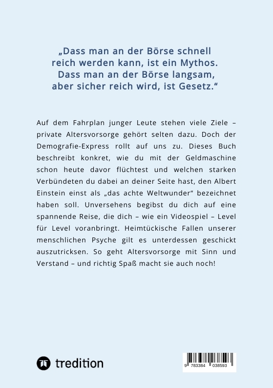 | Schlagworte | 4Z-Kontensystem • 4Z-System • 50-Prozent-Methode • Aktienanlage • Aktienfonds • aktien für anfänger • Aktieninvestitionen • Aktienparadoxon • Aktienportfolio für Anfänger • Aktienrisiko • Altersarmut • Altersvorsorge • Babyboomer • Behavioral Finance • Berufseinsteiger Finanzplanung • Börse für Einsteiger • Börsencrash • Cost-Average-Effekt • DAX • DAX-Aktienindex • DAX-Index • Demografie • Demografieproblem • Demografischer Wandel • Equity-Premium-Puzzle • erfolgreich investieren • ETF • ETF-Geldmaschine • Finanzbildung • Finanzen für Jugendliche • Finanzen in der Schule • finanzielle Bildung • Finanzielle Freiheit • Finanzielle Unabhängigkeit • Finanzpsychologie • Finanztipps • Finanzwissen • Fonds • Fünfzig-fünfzig-Regel • Geld • Geldanlage • geldanlage für anfänger • geldmaschine • Geldmaschine aufbauen • Geldmaschine selbst bauen • Gesetzliche Rente • Hurra eine Geldmaschine • Inflation • Inflation und Geldwert • Investmentfonds • Investmentratgeber • Jugend und Finanzen • Junge Investoren • Maschine • Private Altersvorsorge • private Rente • Psychologie • Realzins • Silvan Schäfer • Sparen • sparen lernen • Sparen und Investieren • Studierende und Geldanlage • Verhalten im Crash • Verhaltensökonomik • Vermögensaufbau • Wertpapiere • Wertpapiermarkt • Wertpapiermarkt für Einsteiger • Zinseszins • Zinseszinseffekt • Zukunft investieren • Zukunftsvorsorge |