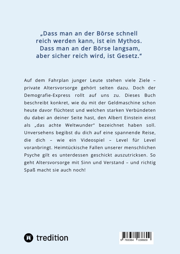 | Schlagworte | 4Z-Kontensystem • 4Z-System • 50-Prozent-Methode • Aktienanlage • Aktienfonds • aktien für anfänger • Aktieninvestitionen • Aktienparadoxon • Aktienportfolio für Anfänger • Aktienrisiko • Altersarmut • Altersvorsorge • Babyboomer • Behavioral Finance • Berufseinsteiger Finanzplanung • Börse für Einsteiger • Börsencrash • Cost-Average-Effekt • DAX • DAX-Aktienindex • DAX-Index • Demografie • Demografieproblem • Demografischer Wandel • Equity-Premium-Puzzle • erfolgreich investieren • ETF • ETF-Geldmaschine • Finanzbildung • Finanzen für Jugendliche • Finanzen in der Schule • finanzielle Bildung • Finanzielle Freiheit • Finanzielle Unabhängigkeit • Finanzpsychologie • Finanztipps • Finanzwissen • Fonds • Fünfzig-fünfzig-Regel • Geld • Geldanlage • geldanlage für anfänger • geldmaschine • Geldmaschine aufbauen • Geldmaschine selbst bauen • Gesetzliche Rente • Hurra eine Geldmaschine • Inflation • Inflation und Geldwert • Investmentfonds • Investmentratgeber • Jugend und Finanzen • Junge Investoren • Maschine • Private Altersvorsorge • private Rente • Psychologie • Realzins • Silvan Schäfer • Sparen • sparen lernen • Sparen und Investieren • Studierende und Geldanlage • Verhalten im Crash • Verhaltensökonomik • Vermögensaufbau • Wertpapiere • Wertpapiermarkt • Wertpapiermarkt für Einsteiger • Zinseszins • Zinseszinseffekt • Zukunft investieren • Zukunftsvorsorge |