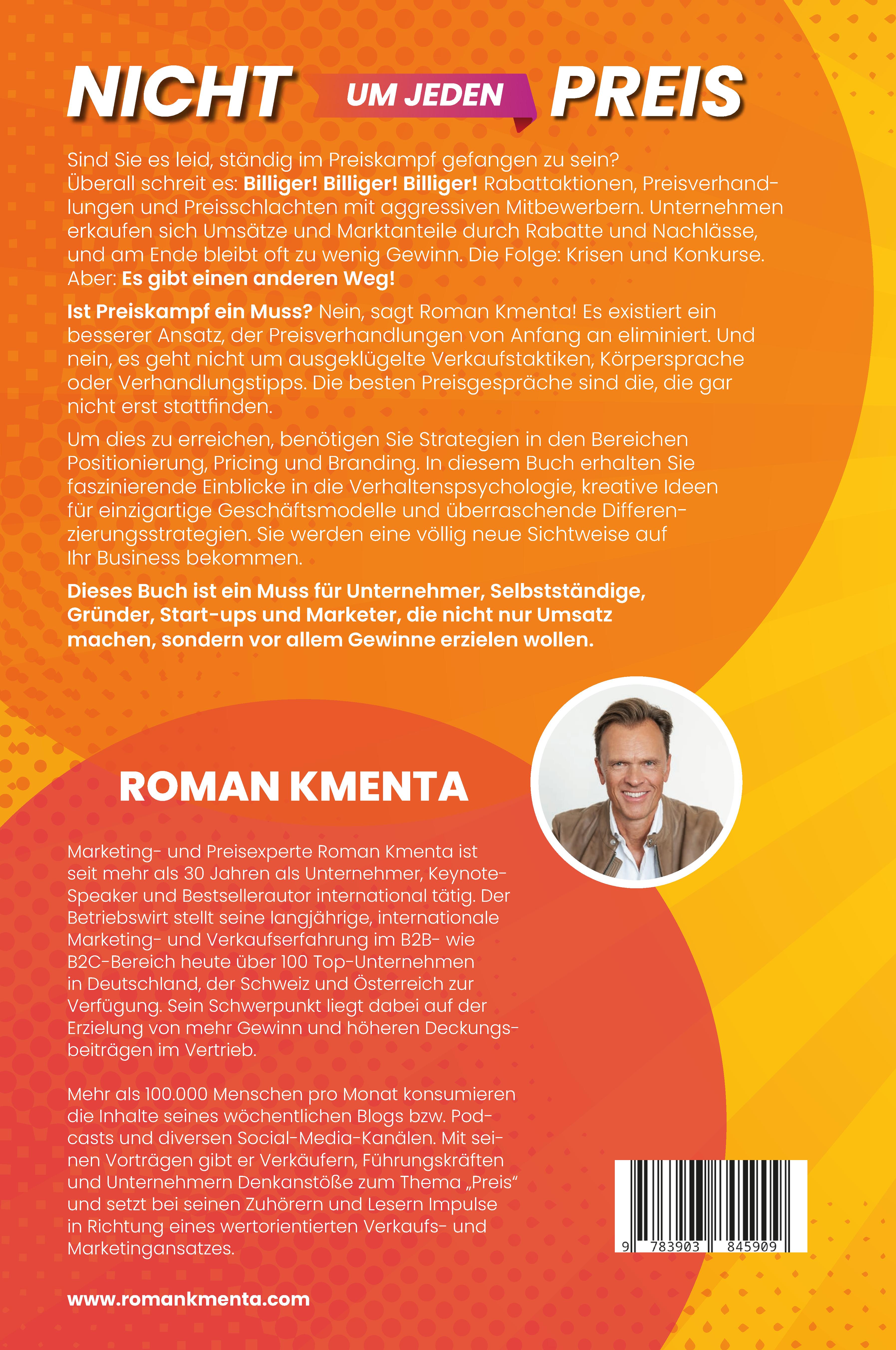 Marketing- und Vertriebsexperte Roman Kmenta ist seit mehr als 30 Jahren als Unternehmer, Keynote Speaker und Bestsellerautor international tätig. Der Betriebswirt und Serienunternehmer stellt seine langjährige, internationale Marketing- und Verkaufserfahrung im B2B- wie B2C-Bereich heute über 100 Top-Unternehmen sowie vielen Kleinunternehmen und Einzelunternehmern in Deutschland, der Schweiz und Österreich zur Verfügung. Mehr als 100.000 Menschen lesen wöchentlich seinen Blog bzw. hören seinen Podcast und verfolgen seine Beiträge auf Social Media. Mit seinen Vorträgen gibt er Verkäufern, Führungskräften und Unternehmern Denkanstöße zum Thema „profitables Wachstum“ und setzt bei seinen Zuhörern und Lesern Impulse in Richtung eines wertorientierten Verkaufs- und Marketingansatzes. Kontakt: +43-676-9653342 rk@romankmenta.com www.romankmenta.com
