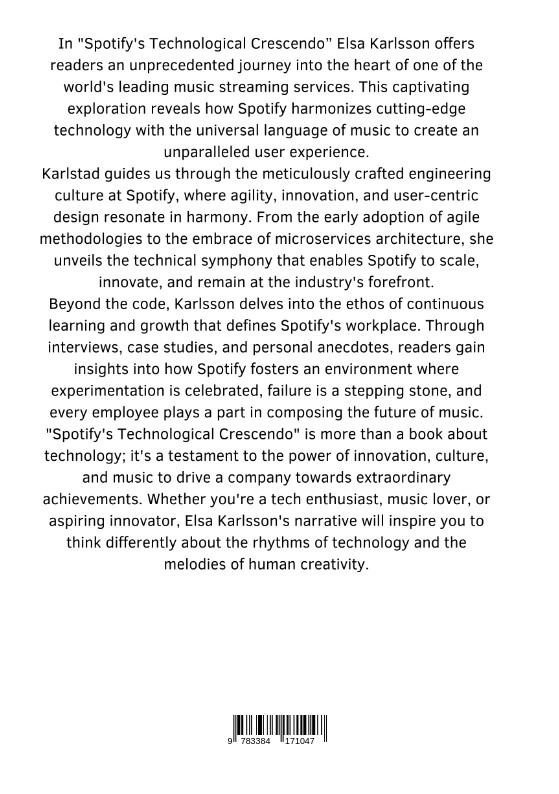 In "Spotify's Technological Crescendo" Elsa Karlsson offers readers an unprecedented journey into the heart of one of the world's leading music streaming services. This captivating exploration reveals how Spotify harmonizes cutting-edge technology with the universal language of music to create an unparalleled user experience.Karlstad guides us through the meticulously crafted engineering culture at Spotify, where agility, innovation, and user-centric design resonate in harmony. From the early adoption of agile methodologies to the embrace of microservices architecture, she unveils the technical symphony that enables Spotify to scale, innovate, and remain at the industry's forefront.Beyond the code, Karlsson delves into the ethos of continuous learning and growth that defines Spotify's workplace. Through interviews, case studies, and personal anecdotes, readers gain insights into how Spotify fosters an environment where experimentation is celebrated, failure is a stepping stone, and every employee plays a part in composing the future of music."Spotify's Technological Crescendo" is more than a book about technology; it's a testament to the power of innovation, culture, and music to drive a company towards extraordinary achievements. Whether you're a tech enthusiast, music lover, or aspiring innovator, Elsa Karlsson's narrative will inspire you to think differently about the rhythms of technology and the melodies of human creativity.