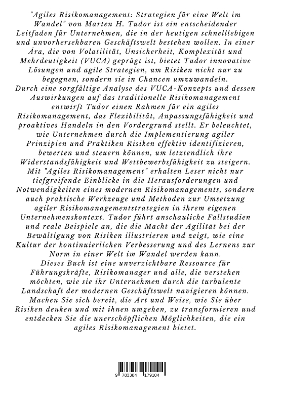 "Agiles Risikomanagement: Strategien für eine Welt im Wandel" von Marten H. Tudor ist ein entscheidender Leitfaden für Unternehmen, die in der heutigen schnelllebigen und unvorhersehbaren Geschäftswelt bestehen wollen. In einer Ära, die von Volatilität, Unsicherheit, Komplexität und Mehrdeutigkeit (VUCA) geprägt ist, bietet Tudor innovative Lösungen und agile Strategien, um Risiken nicht nur zu begegnen, sondern sie in Chancen umzuwandeln.Durch eine sorgfältige Analyse des VUCA-Konzepts und dessen Auswirkungen auf das traditionelle Risikomanagement entwirft Tudor einen Rahmen für ein agiles Risikomanagement, das Flexibilität, Anpassungsfähigkeit und proaktives Handeln in den Vordergrund stellt. Er beleuchtet, wie Unternehmen durch die Implementierung agiler Prinzipien und Praktiken Risiken effektiv identifizieren, bewerten und steuern können, um letztendlich ihre Widerstandsfähigkeit und Wettbewerbsfähigkeit zu steigern.Mit "Agiles Risikomanagement" erhalten Leser nicht nur tiefgreifende Einblicke in die Herausforderungen und Notwendigkeiten eines modernen Risikomanagements, sondern auch praktische Werkzeuge und Methoden zur Umsetzung agiler Risikomanagementstrategien in ihrem eigenen Unternehmenskontext. Tudor führt anschauliche Fallstudien und reale Beispiele an, die die Macht der Agilität bei der Bewältigung von Risiken illustrieren und zeigt, wie eine Kultur der kontinuierlichen Verbesserung und des Lernens zur Norm in einer Welt im Wandel werden kann.Dieses Buch ist eine unverzichtbare Ressource für Führungskräfte, Risikomanager und alle, die verstehen möchten, wie sie ihr Unternehmen durch die turbulente Landschaft der modernen Geschäftswelt navigieren können. Machen Sie sich bereit, die Art und Weise, wie Sie über Risiken denken und mit ihnen umgehen, zu transformieren und entdecken Sie die unerschöpflichen Möglichkeiten, die ein agiles Risikomanagement bietet.