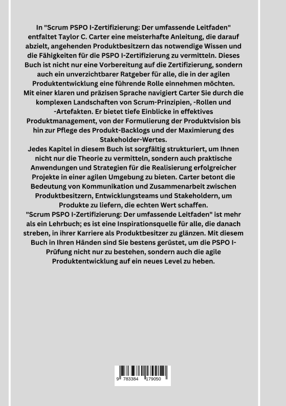 In "Scrum PSPO I-Zertifizierung: Der umfassende Leitfaden" entfaltet Taylor C. Carter eine meisterhafte Anleitung, die darauf abzielt, angehenden Produktbesitzern das notwendige Wissen und die Fähigkeiten für die PSPO I-Zertifizierung zu vermitteln. Dieses Buch ist nicht nur eine Vorbereitung auf die Zertifizierung, sondern auch ein unverzichtbarer Ratgeber für alle, die in der agilen Produktentwicklung eine führende Rolle einnehmen möchten.Mit einer klaren und präzisen Sprache navigiert Carter Sie durch die komplexen Landschaften von Scrum-Prinzipien, -Rollen und -Artefakten. Er bietet tiefe Einblicke in effektives Produktmanagement, von der Formulierung der Produktvision bis hin zur Pflege des Produkt-Backlogs und der Maximierung des Stakeholder-Wertes.Jedes Kapitel in diesem Buch ist sorgfältig strukturiert, um Ihnen nicht nur die Theorie zu vermitteln, sondern auch praktische Anwendungen und Strategien für die Realisierung erfolgreicher Projekte in einer agilen Umgebung zu bieten. Carter betont die Bedeutung von Kommunikation und Zusammenarbeit zwischen Produktbesitzern, Entwicklungsteams und Stakeholdern, um Produkte zu liefern, die echten Wert schaffen."Scrum PSPO I-Zertifizierung: Der umfassende Leitfaden" ist mehr als ein Lehrbuch; es ist eine Inspirationsquelle für alle, die danach streben, in ihrer Karriere als Produktbesitzer zu glänzen. Mit diesem Buch in Ihren Händen sind Sie bestens gerüstet, um die PSPO I-Prüfung nicht nur zu bestehen, sondern auch die agile Produktentwicklung auf ein neues Level zu heben.