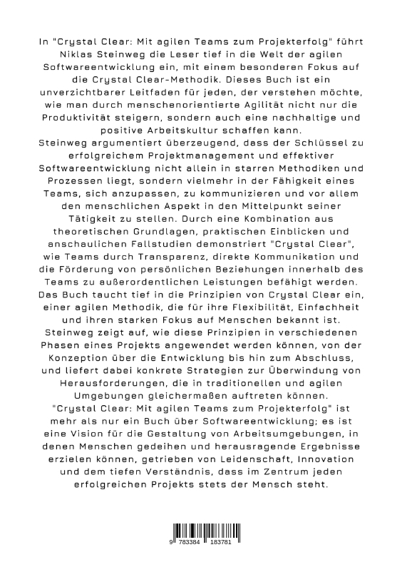 In "Crystal Clear: Mit agilen Teams zum Projekterfolg" führt Niklas Steinweg die Leser tief in die Welt der agilen Softwareentwicklung ein, mit einem besonderen Fokus auf die Crystal Clear-Methodik. Dieses Buch ist ein unverzichtbarer Leitfaden für jeden, der verstehen möchte, wie man durch menschenorientierte Agilität nicht nur die Produktivität steigern, sondern auch eine nachhaltige und positive Arbeitskultur schaffen kann.Steinweg argumentiert überzeugend, dass der Schlüssel zu erfolgreichem Projektmanagement und effektiver Softwareentwicklung nicht allein in starren Methodiken und Prozessen liegt, sondern vielmehr in der Fähigkeit eines Teams, sich anzupassen, zu kommunizieren und vor allem den menschlichen Aspekt in den Mittelpunkt seiner Tätigkeit zu stellen. Durch eine Kombination aus theoretischen Grundlagen, praktischen Einblicken und anschaulichen Fallstudien demonstriert "Crystal Clear", wie Teams durch Transparenz, direkte Kommunikation und die Förderung von persönlichen Beziehungen innerhalb des Teams zu außerordentlichen Leistungen befähigt werden.Das Buch taucht tief in die Prinzipien von Crystal Clear ein, einer agilen Methodik, die für ihre Flexibilität, Einfachheit und ihren starken Fokus auf Menschen bekannt ist. Steinweg zeigt auf, wie diese Prinzipien in verschiedenen Phasen eines Projekts angewendet werden können, von der Konzeption über die Entwicklung bis hin zum Abschluss, und liefert dabei konkrete Strategien zur Überwindung von Herausforderungen, die in traditionellen und agilen Umgebungen gleichermaßen auftreten können."Crystal Clear: Mit agilen Teams zum Projekterfolg" ist mehr als nur ein Buch über Softwareentwicklung; es ist eine Vision für die Gestaltung von Arbeitsumgebungen, in denen Menschen gedeihen und herausragende Ergebnisse erzielen können, getrieben von Leidenschaft, Innovation und dem tiefen Verständnis, dass im Zentrum jeden erfolgreichen Projekts stets der Mensch steht.