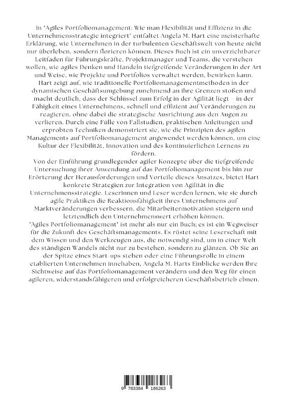 In "Agiles Portfoliomanagement: Wie man Flexibilität und Effizienz in die Unternehmensstrategie integriert" entfaltet Angela M. Hart eine meisterhafte Erklärung, wie Unternehmen in der turbulenten Geschäftswelt von heute nicht nur überleben, sondern florieren können. Dieses Buch ist ein unverzichtbarer Leitfaden für Führungskräfte, Projektmanager und Teams, die verstehen wollen, wie agiles Denken und Handeln tiefgreifende Veränderungen in der Art und Weise, wie Projekte und Portfolios verwaltet werden, bewirken kann.Hart zeigt auf, wie traditionelle Portfoliomanagementmethoden in der dynamischen Geschäftsumgebung zunehmend an ihre Grenzen stoßen und macht deutlich, dass der Schlüssel zum Erfolg in der Agilität liegt - in der Fähigkeit eines Unternehmens, schnell und effizient auf Veränderungen zu reagieren, ohne dabei die strategische Ausrichtung aus den Augen zu verlieren. Durch eine Fülle von Fallstudien, praktischen Anleitungen und erprobten Techniken demonstriert sie, wie die Prinzipien des agilen Managements auf Portfoliomanagement angewendet werden können, um eine Kultur der Flexibilität, Innovation und des kontinuierlichen Lernens zu fördern.Von der Einführung grundlegender agiler Konzepte über die tiefgreifende Untersuchung ihrer Anwendung auf das Portfoliomanagement bis hin zur Erörterung der Herausforderungen und Vorteile dieses Ansatzes, bietet Hart konkrete Strategien zur Integration von Agilität in die Unternehmensstrategie. Leserinnen und Leser werden lernen, wie sie durch agile Praktiken die Reaktionsfähigkeit ihres Unternehmens auf Marktveränderungen verbessern, die Mitarbeitermotivation steigern und letztendlich den Unternehmenswert erhöhen können."Agiles Portfoliomanagement" ist mehr als nur ein Buch; es ist ein Wegweiser für die Zukunft des Geschäftsmanagements. Es rüstet seine Leserschaft mit dem Wissen und den Werkzeugen aus, die notwendig sind, um in einer Welt des ständigen Wandels nicht nur zu bestehen, sondern zu glänzen. Ob Sie an der Spitze eines Start-ups stehen oder eine Führungsrolle in einem etablierten Unternehmen innehaben, Angela M. Harts Einblicke werden Ihre Sichtweise auf das Portfoliomanagement verändern und den Weg für einen agileren, widerstandsfähigeren und erfolgreicheren Geschäftsbetrieb ebnen.