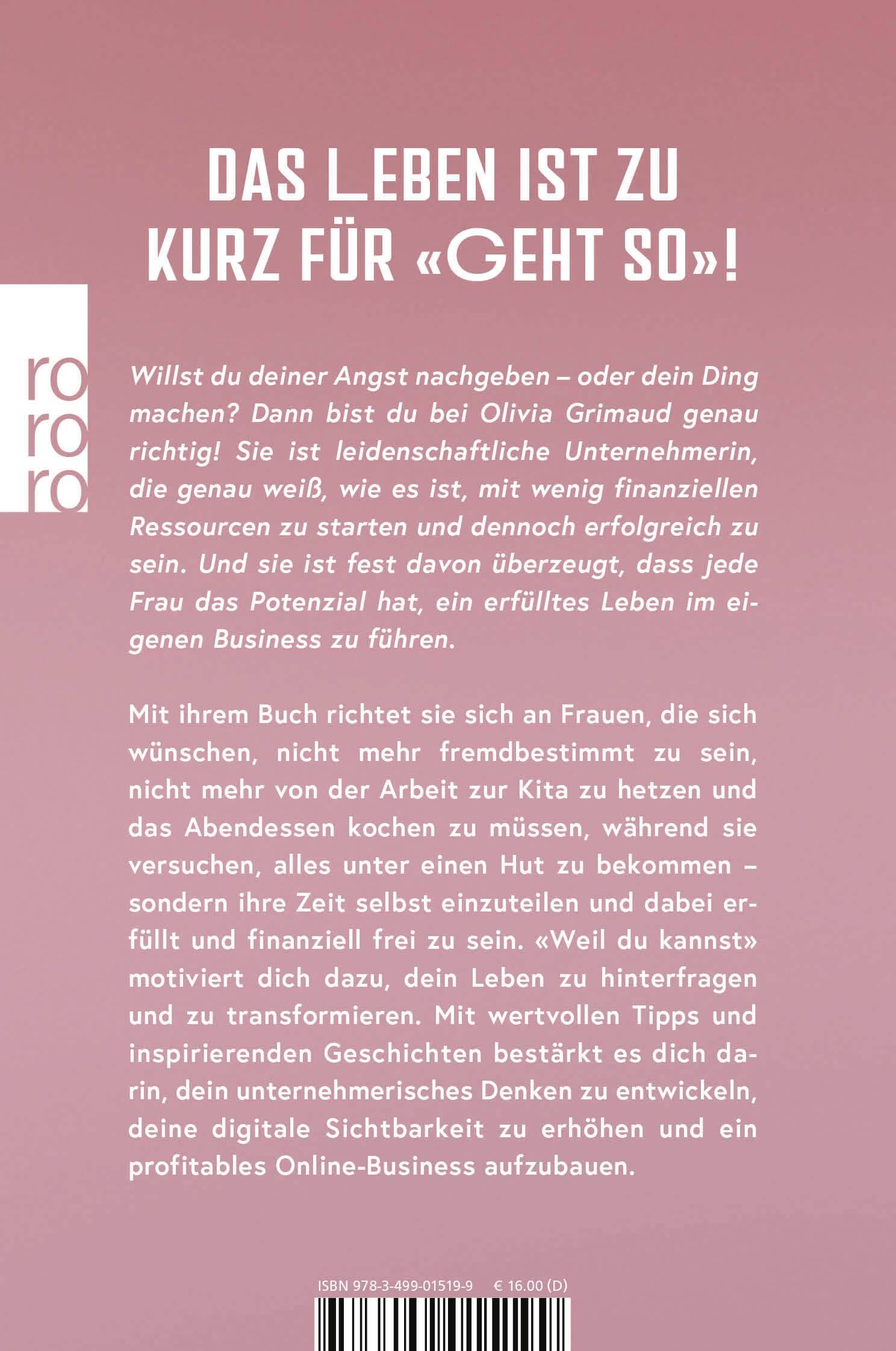 Mit ihrem Buch richtet sie sich an Frauen, die sich wünschen, nicht mehr fremdbestimmt zu sein, nicht mehr von der Arbeit zur Kita zu hetzen und das Abendessen kochen zu müssen, während sie versuchen, alles unter einen Hut zu bekommen - sondern etwas Sinnvolles zu tun, ihre Zeit selbst einzuteilen und dabei erfüllt und finanziell frei zu sein. «Weil du kannst» motiviert dazu, das eigene Leben zu hinterfragen, zu transformieren, stärkt Frauen dabei, ihr unternehmerisches Denken zu entwickeln, ihre digitale Sichtbarkeit zu erhöhen und ein profitables Business aufzubauen - mit wertvollen Tipps und inspirierenden Geschichten.
