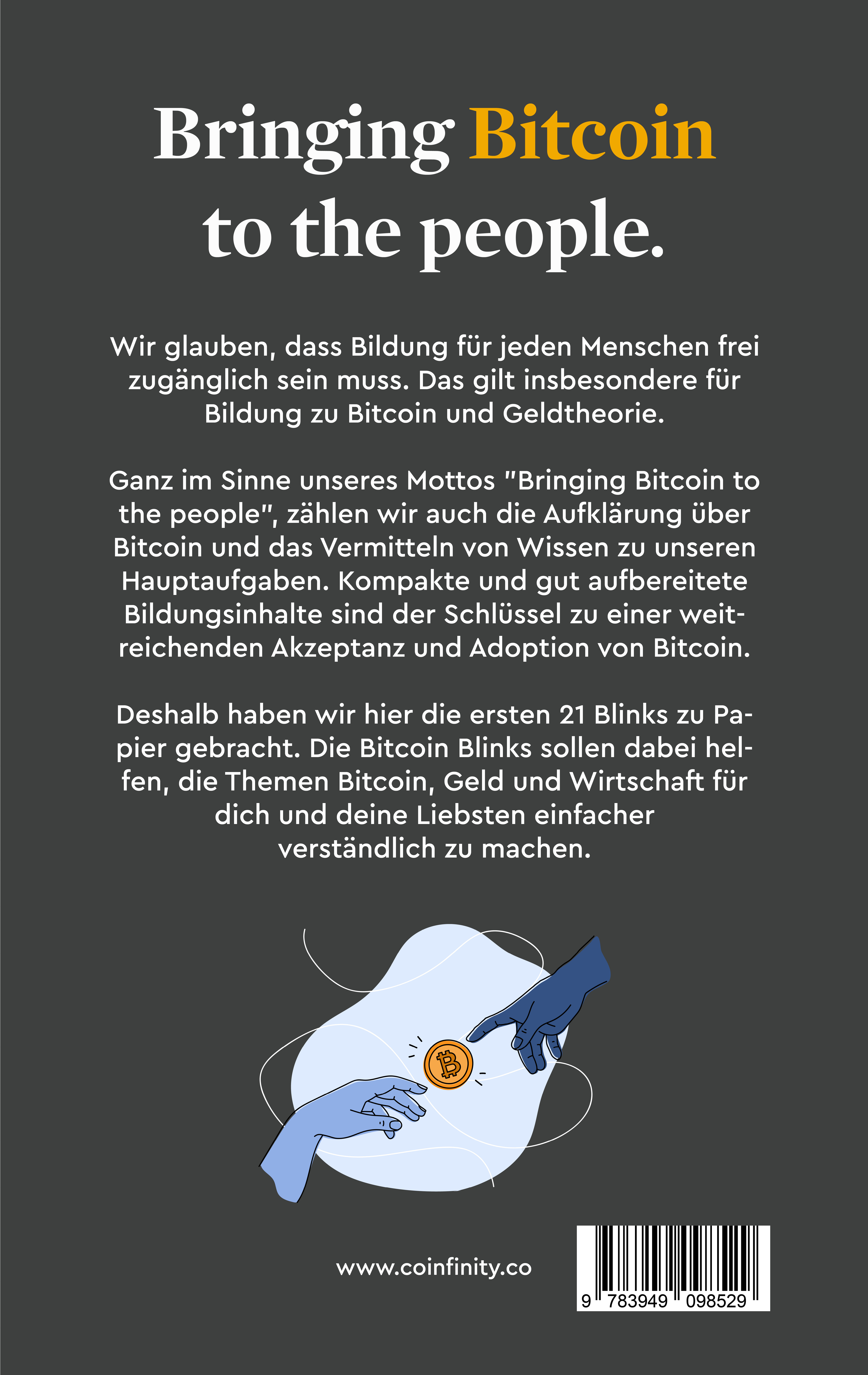 Wir leben in einer Zeit, in der das Wissen über Geld, das Finanzsystem und vor allem Bitcoin zunehmend an Bedeutung gewinnt. Aus dieser Motivation heraus haben wir von Coinfinity die Bitcoin Blinks geschrieben, um Einsteigerinnen und Einsteigern einen unverzichtbaren Leitfaden an die Hand zu geben. Dieses Buch basiert auf der Überzeugung, dass Bitcoin-Bildung und Geldtheorie so einfach und zugänglich wie möglich sein sollten. Im Einklang mit unserem Engagement für die Bitcoin-Community und die Weiterentwicklung dieser revolutionären Technologie spendet Coinfinity 1€ von jedem Verkauf an die Bitcoin-Entwicklung, um Innovation und Wachstum in diesem Bereich zu fördern. Die ausgewählte Organisation wird einmal jährlich bekannt gegeben, um Transparenz und Unterstützung für die kontinuierliche Innovation im Bitcoin-Ökosystem zu gewährleisten.