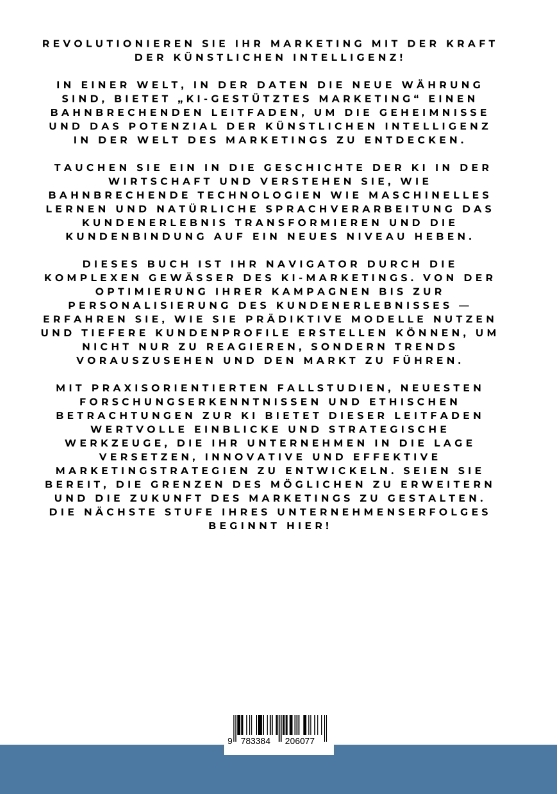 Revolutionieren Sie Ihr Marketing mit der Kraft der Künstlichen Intelligenz!In einer Welt, in der Daten die neue Währung sind, bietet "KI-gestütztes Marketing" einen bahnbrechenden Leitfaden, um die Geheimnisse und das Potenzial der Künstlichen Intelligenz in der Welt des Marketings zu entdecken. Tauchen Sie ein in die Geschichte der KI in der Wirtschaft und verstehen Sie, wie bahnbrechende Technologien wie maschinelles Lernen und natürliche Sprachverarbeitung das Kundenerlebnis transformieren und die Kundenbindung auf ein neues Niveau heben.Dieses Buch ist Ihr Navigator durch die komplexen Gewässer des KI-Marketings. Von der Optimierung Ihrer Kampagnen bis zur Personalisierung des Kundenerlebnisses - erfahren Sie, wie Sie prädiktive Modelle nutzen und tiefere Kundenprofile erstellen können, um nicht nur zu reagieren, sondern Trends vorauszusehen und den Markt zu führen.Mit praxisorientierten Fallstudien, neuesten Forschungserkenntnissen und ethischen Betrachtungen zur KI bietet dieser Leitfaden wertvolle Einblicke und strategische Werkzeuge, die Ihr Unternehmen in die Lage versetzen, innovative und effektive Marketingstrategien zu entwickeln. Seien Sie bereit, die Grenzen des Möglichen zu erweitern und die Zukunft des Marketings zu gestalten. Die nächste Stufe Ihres Unternehmenserfolges beginnt hier!
