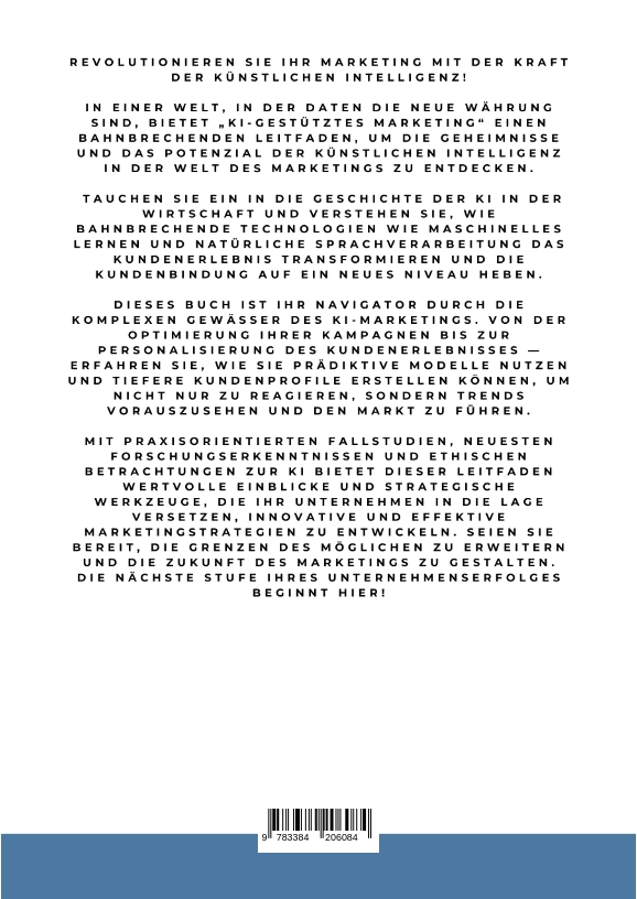 Revolutionieren Sie Ihr Marketing mit der Kraft der Künstlichen Intelligenz!In einer Welt, in der Daten die neue Währung sind, bietet "KI-gestütztes Marketing" einen bahnbrechenden Leitfaden, um die Geheimnisse und das Potenzial der Künstlichen Intelligenz in der Welt des Marketings zu entdecken. Tauchen Sie ein in die Geschichte der KI in der Wirtschaft und verstehen Sie, wie bahnbrechende Technologien wie maschinelles Lernen und natürliche Sprachverarbeitung das Kundenerlebnis transformieren und die Kundenbindung auf ein neues Niveau heben.Dieses Buch ist Ihr Navigator durch die komplexen Gewässer des KI-Marketings. Von der Optimierung Ihrer Kampagnen bis zur Personalisierung des Kundenerlebnisses - erfahren Sie, wie Sie prädiktive Modelle nutzen und tiefere Kundenprofile erstellen können, um nicht nur zu reagieren, sondern Trends vorauszusehen und den Markt zu führen.Mit praxisorientierten Fallstudien, neuesten Forschungserkenntnissen und ethischen Betrachtungen zur KI bietet dieser Leitfaden wertvolle Einblicke und strategische Werkzeuge, die Ihr Unternehmen in die Lage versetzen, innovative und effektive Marketingstrategien zu entwickeln. Seien Sie bereit, die Grenzen des Möglichen zu erweitern und die Zukunft des Marketings zu gestalten. Die nächste Stufe Ihres Unternehmenserfolges beginnt hier!