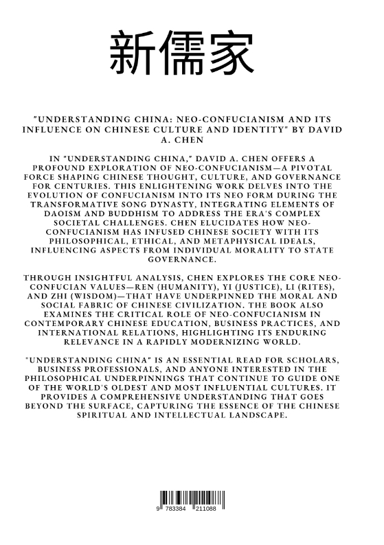 "Understanding China: Neo-Confucianism and Its Influence on Chinese Culture and Identity" by David A. ChenIn "Understanding China," David A. Chen offers a profound exploration of Neo-Confucianism-a pivotal force shaping Chinese thought, culture, and governance for centuries. This enlightening work delves into the evolution of Confucianism into its Neo form during the transformative Song Dynasty, integrating elements of Daoism and Buddhism to address the era's complex societal challenges. Chen elucidates how Neo-Confucianism has infused Chinese society with its philosophical, ethical, and metaphysical ideals, influencing aspects from individual morality to state governance.Through insightful analysis, Chen explores the core Neo-Confucian values-Ren (humanity), Yi (justice), Li (rites), and Zhi (wisdom)-that have underpinned the moral and social fabric of Chinese civilization. The book also examines the critical role of Neo-Confucianism in contemporary Chinese education, business practices, and international relations, highlighting its enduring relevance in a rapidly modernizing world."Understanding China" is an essential read for scholars, business professionals, and anyone interested in the philosophical underpinnings that continue to guide one of the world's oldest and most influential cultures. It provides a comprehensive understanding that goes beyond the surface, capturing the essence of the Chinese spiritual and intellectual landscape.
