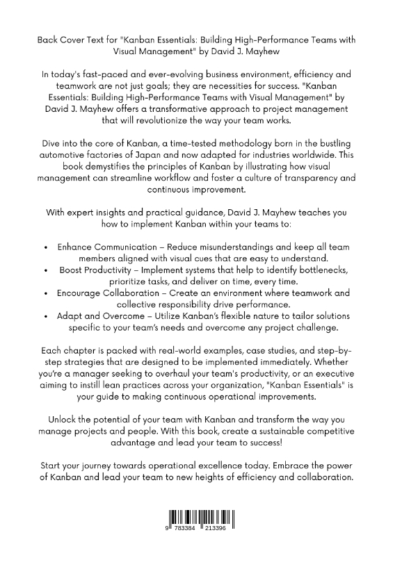 Back Cover Text for "Kanban Essentials: Building High-Performance Teams with Visual Management" by David J. MayhewIn today's fast-paced and ever-evolving business environment, efficiency and teamwork are not just goals; they are necessities for success. "Kanban Essentials: Building High-Performance Teams with Visual Management" by David J. Mayhew offers a transformative approach to project management that will revolutionize the way your team works.Dive into the core of Kanban, a time-tested methodology born in the bustling automotive factories of Japan and now adapted for industries worldwide. This book demystifies the principles of Kanban by illustrating how visual management can streamline workflow and foster a culture of transparency and continuous improvement.With expert insights and practical guidance, David J. Mayhew teaches you how to implement Kanban within your teams to:* Enhance Communication - Reduce misunderstandings and keep all team members aligned with visual cues that are easy to understand.* Boost Productivity - Implement systems that help to identify bottlenecks, prioritize tasks, and deliver on time, every time.* Encourage Collaboration - Create an environment where teamwork and collective responsibility drive performance.* Adapt and Overcome - Utilize Kanban's flexible nature to tailor solutions specific to your team's needs and overcome any project challenge.Each chapter is packed with real-world examples, case studies, and step-by-step strategies that are designed to be implemented immediately. Whether you're a manager seeking to overhaul your team's productivity, or an executive aiming to instill lean practices across your organization, "Kanban Essentials" is your guide to making continuous operational improvements.Unlock the potential of your team with Kanban and transform the way you manage projects and people. With this book, create a sustainable competitive advantage and lead your team to success!Start your journey towards operational excellence today. Embrace the power of Kanban and lead your team to new heights of efficiency and collaboration.